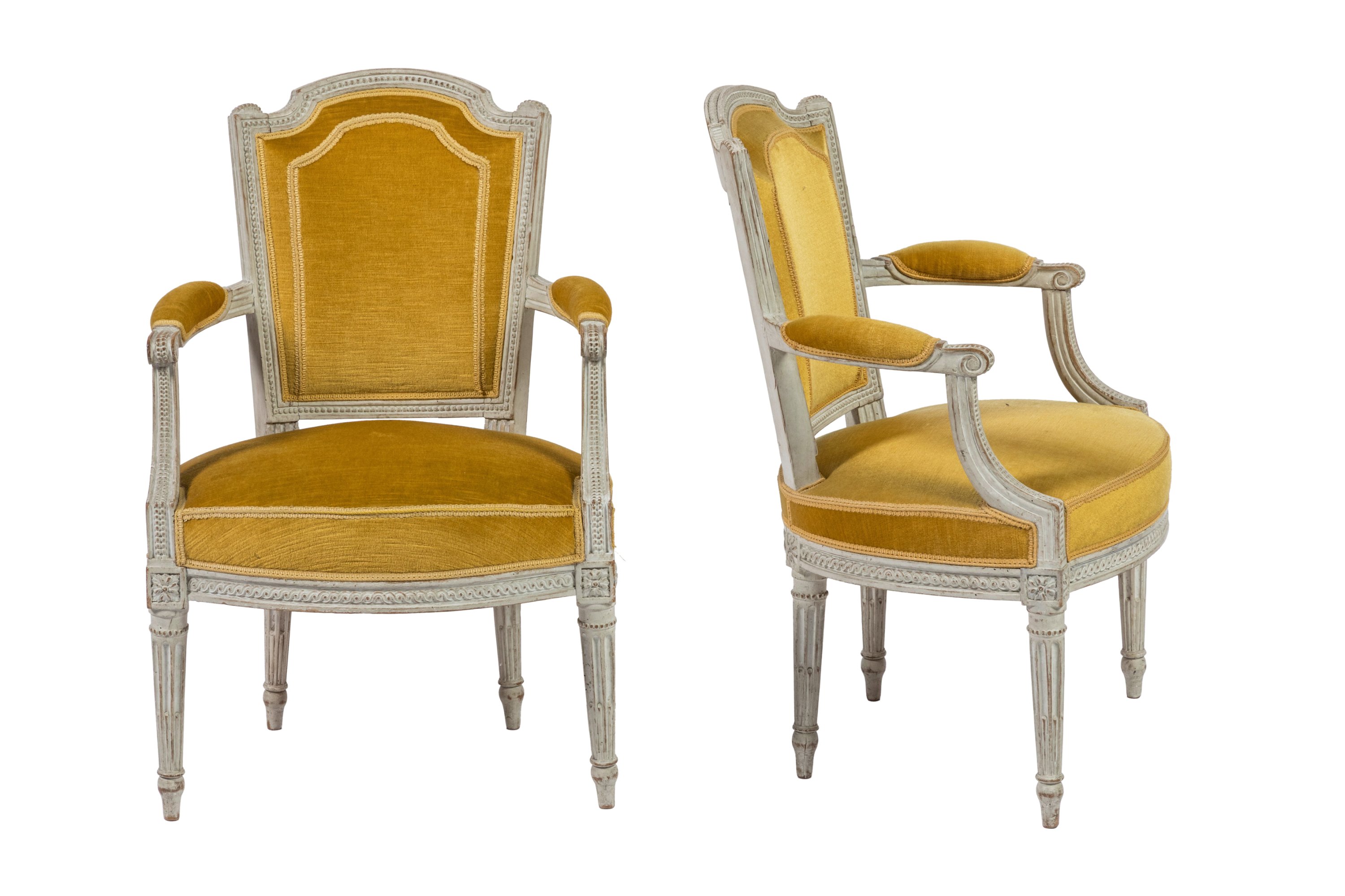 A pair of carved, moulded and lacquered cabriolet armchairs reportedly from the Champlâtreux castle. Georges Jacob stamp. Yellow velvet upholstery. Louis XVI Period.