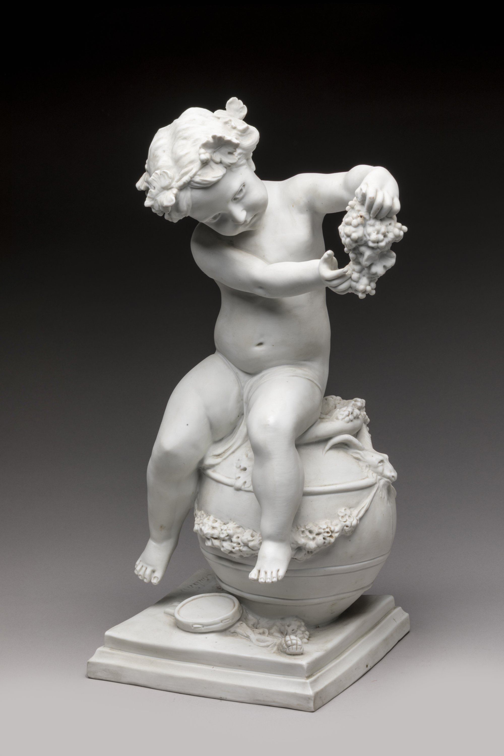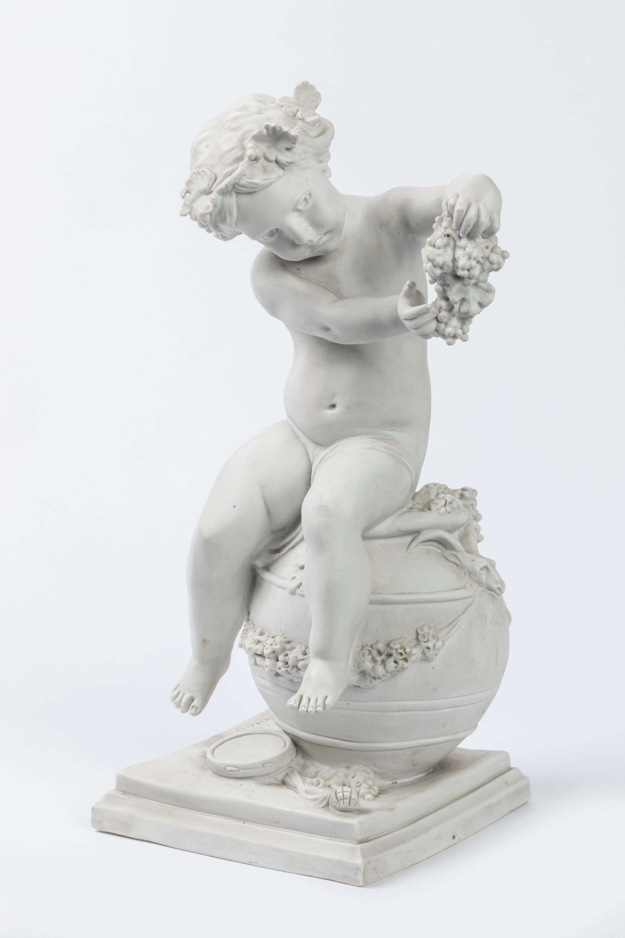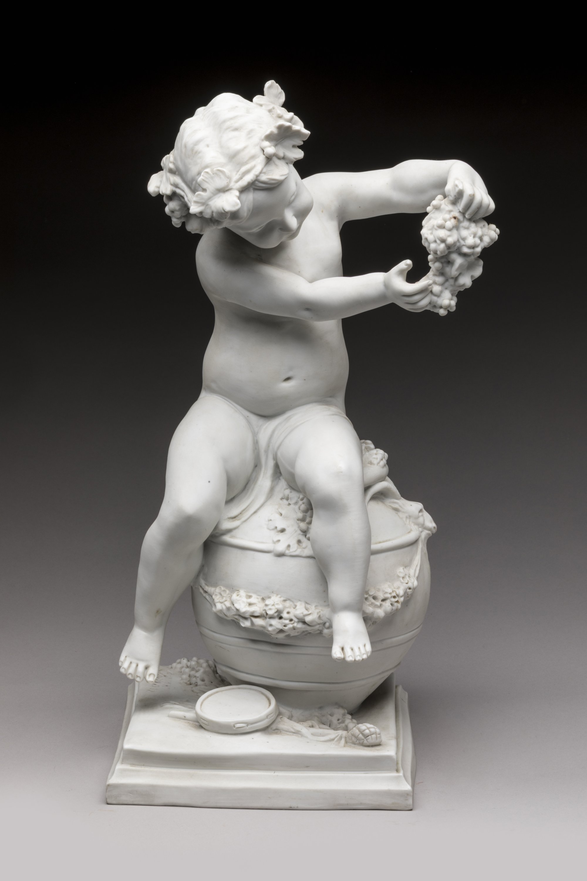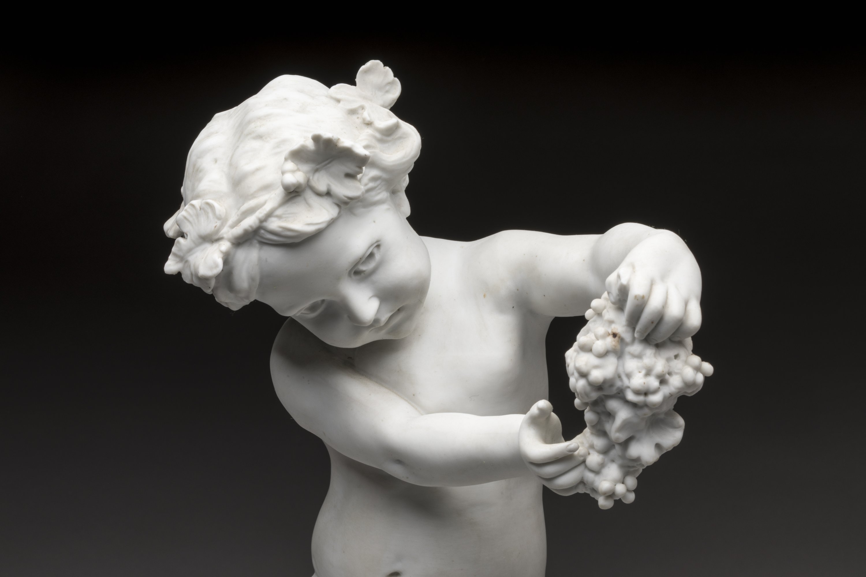 After Claude Michel Clodion. A biscuit porcelain figure of Bacchus as a child. Signed.