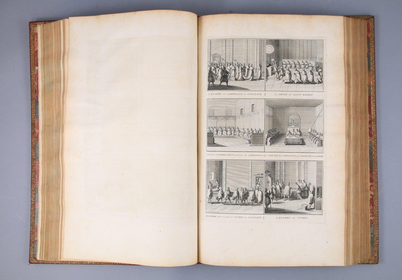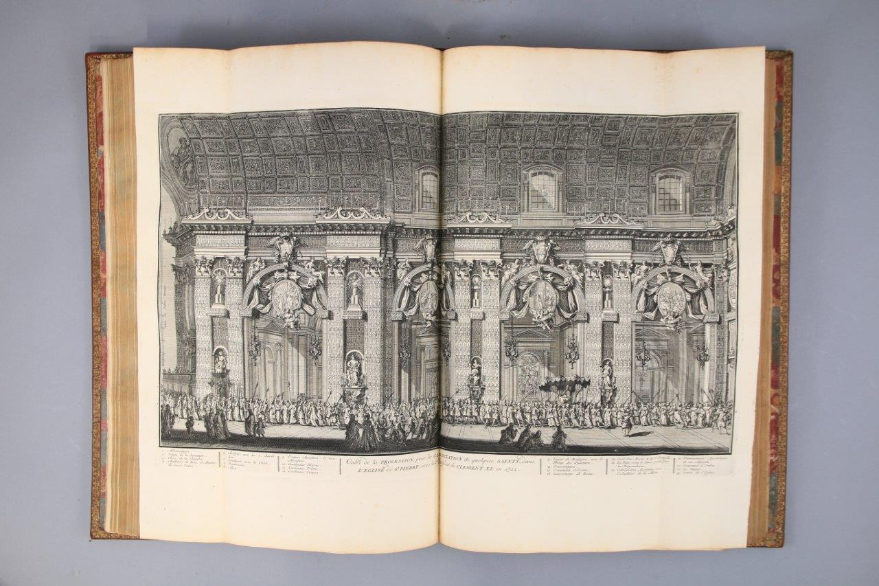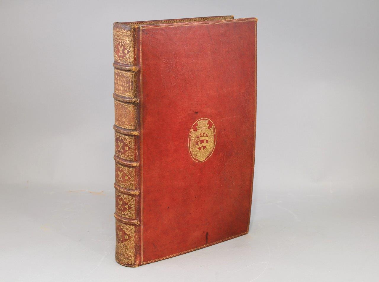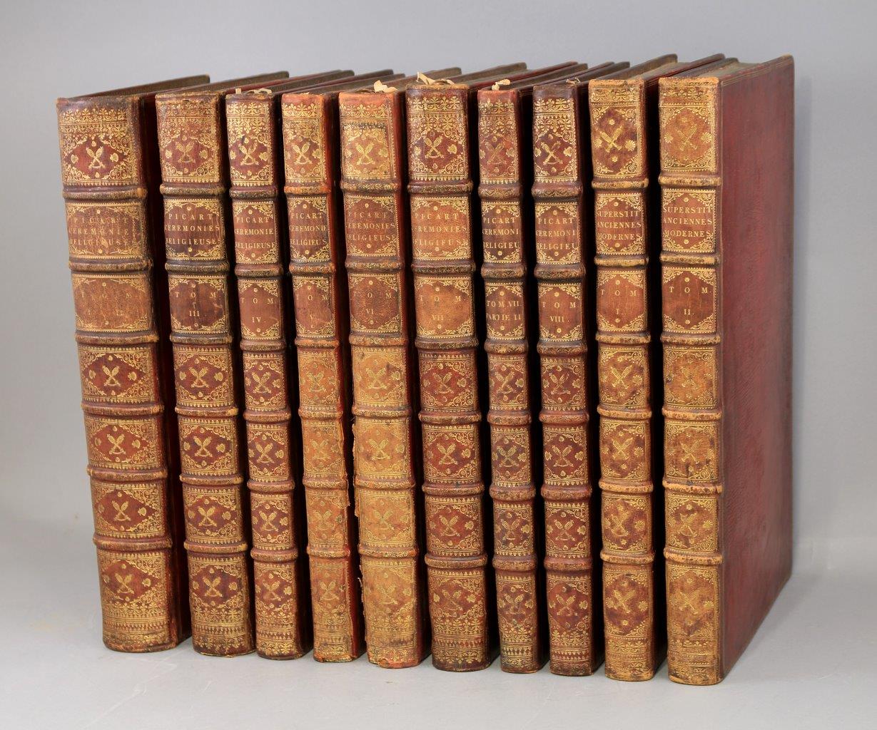 Soit : 11 tomes reliés en 10 volumes grand in-folio, illustrés de 265 gravures sur cuivre. Plein maroquin rouge du Levant ; trois filets droits d’encadrement. Au centre des plats des 8 premiers volumes -soit les 9 tomes des Cérémonies et coutumes de tous les peuples- grandes armes d’Henri François D'Aguesseau. Décor identique sur le dos des 10 volumes, avec, dans les entre-nerfs, masses du Chancelier D'Aguesseau entrecroisées, entourées de coquilles, et cernées de petits fers ; roulette sur les nerfs. Roulette sur les coupes. Roulette sur les chasses. Toutes tranches dorées.