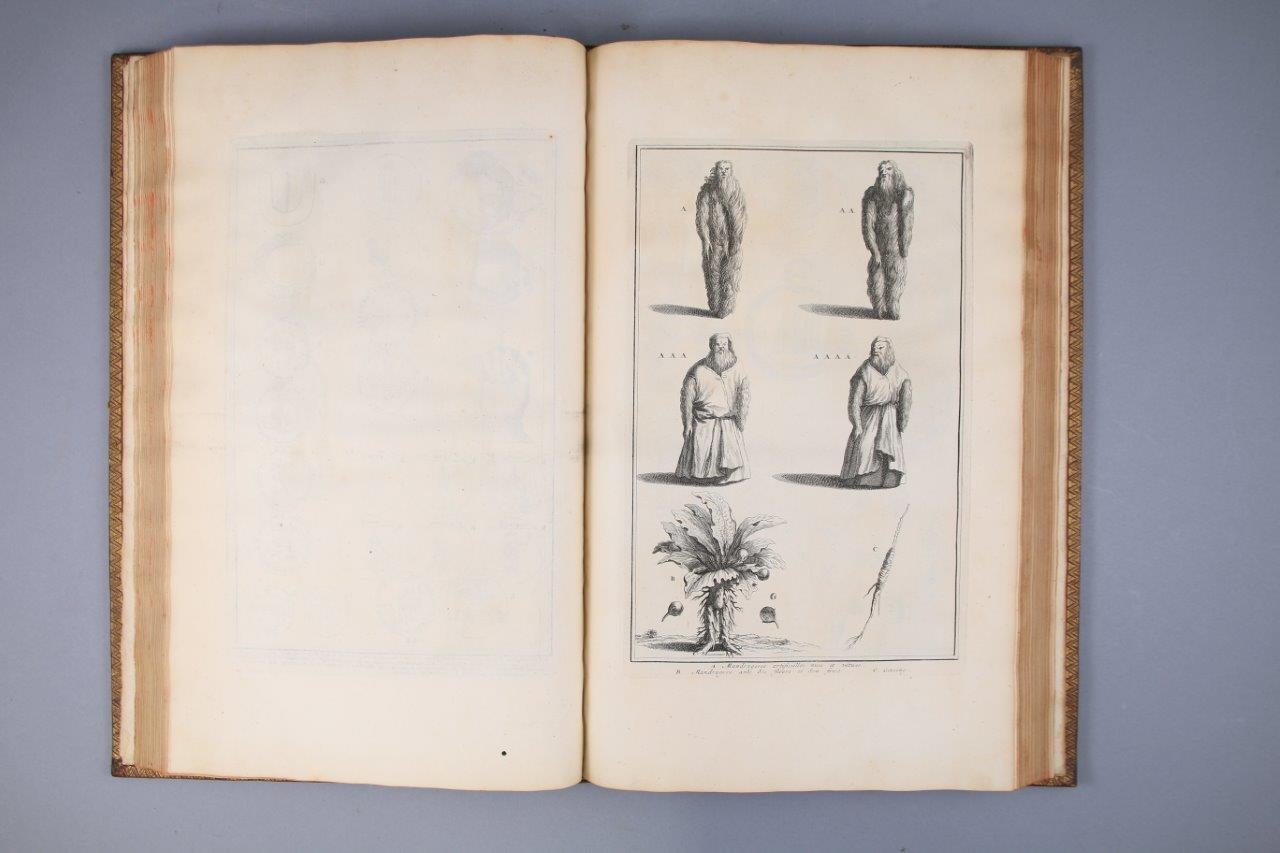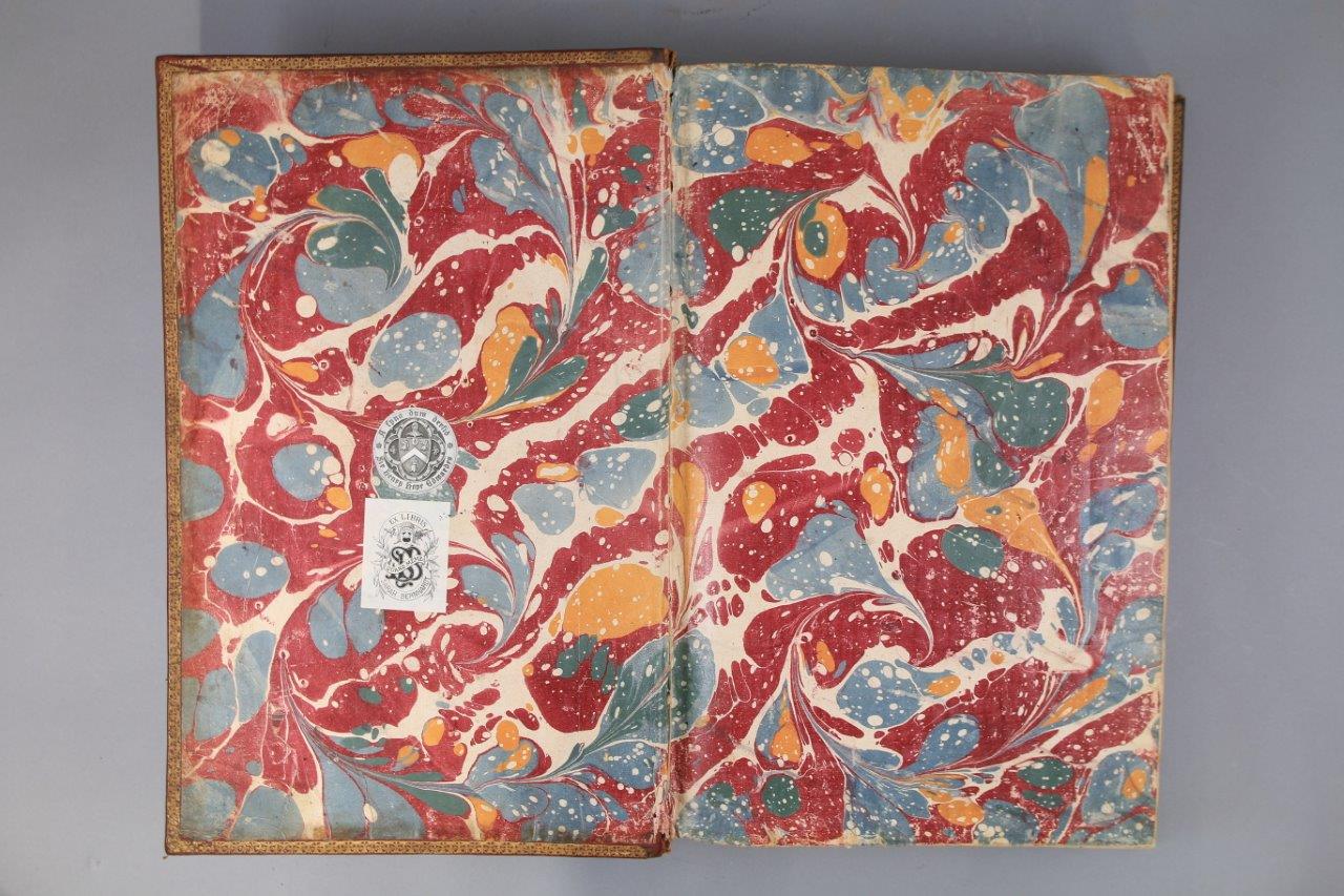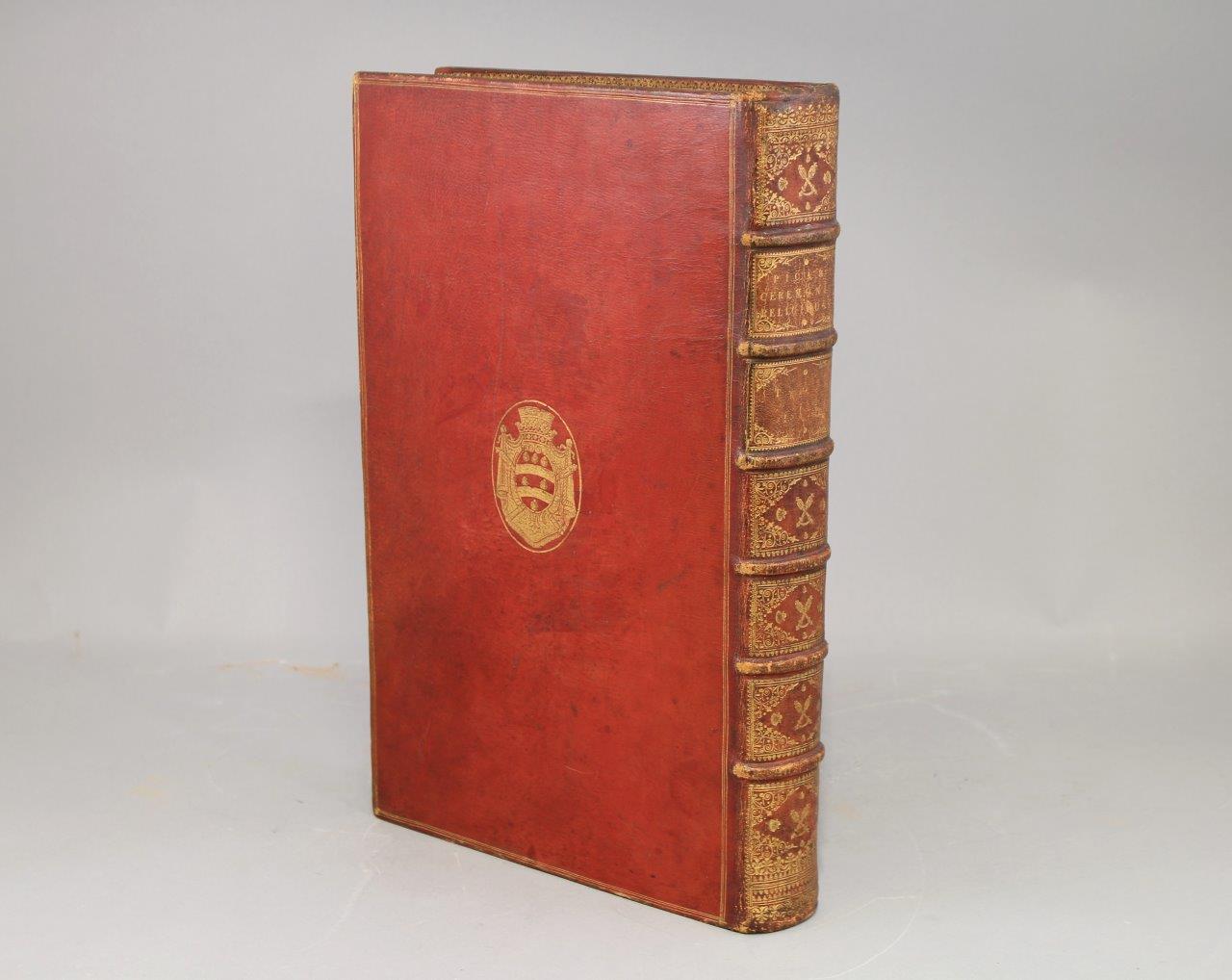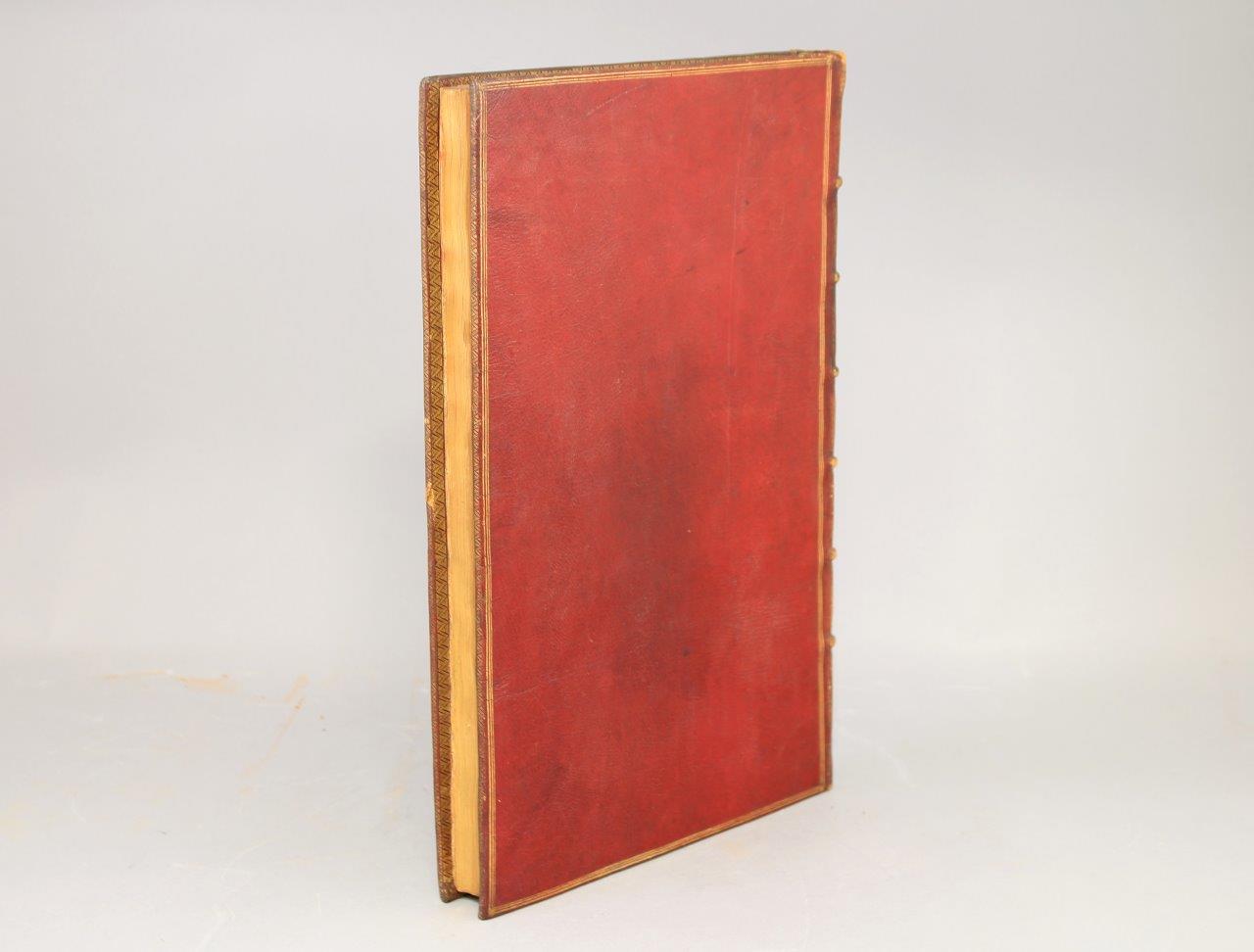Soit : 11 tomes reliés en 10 volumes grand in-folio, illustrés de 265 gravures sur cuivre. Plein maroquin rouge du Levant ; trois filets droits d’encadrement. Au centre des plats des 8 premiers volumes -soit les 9 tomes des Cérémonies et coutumes de tous les peuples- grandes armes d’Henri François D'Aguesseau. Décor identique sur le dos des 10 volumes, avec, dans les entre-nerfs, masses du Chancelier D'Aguesseau entrecroisées, entourées de coquilles, et cernées de petits fers ; roulette sur les nerfs. Roulette sur les coupes. Roulette sur les chasses. Toutes tranches dorées.