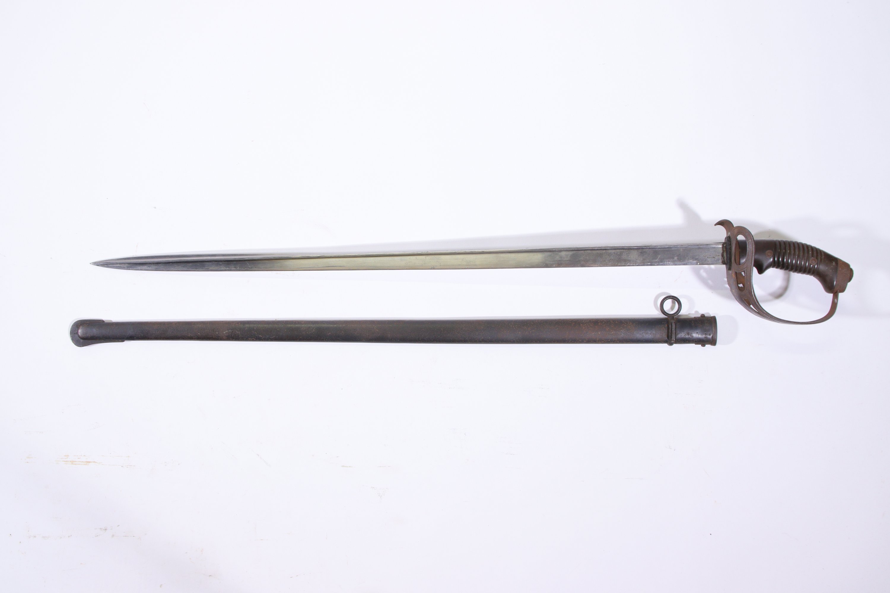 Poignée en caoutchouc. Monture en fer, garde à coquille à l’aigle prussien. Lame à dos rond datée 12 de « Weyerbserg Kirschbaum ».