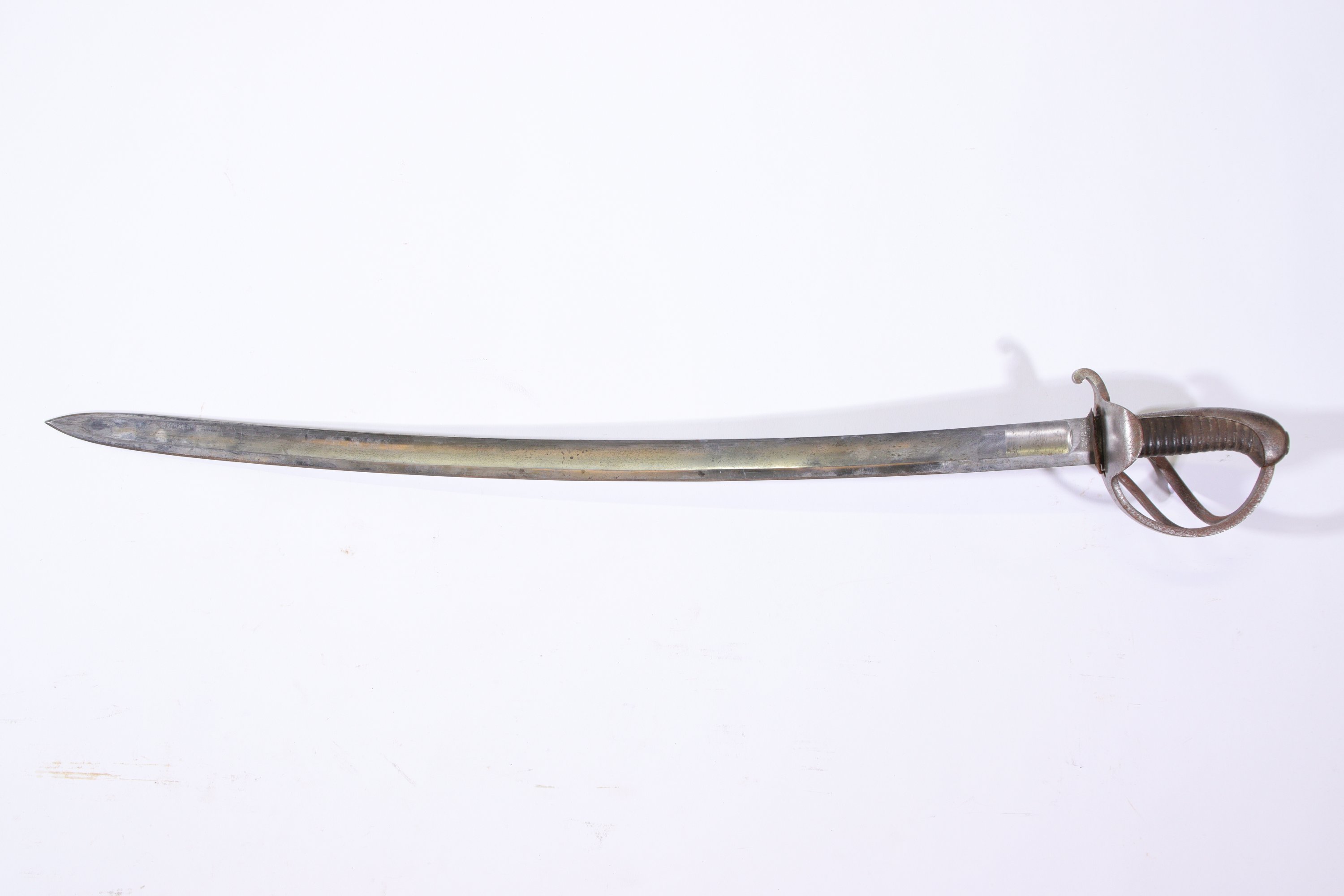Poignée recouverte de cuir. Monture en fer, garde à trois branches. Lame courbe à dos plat marquée de Weyersberg et Amberg.