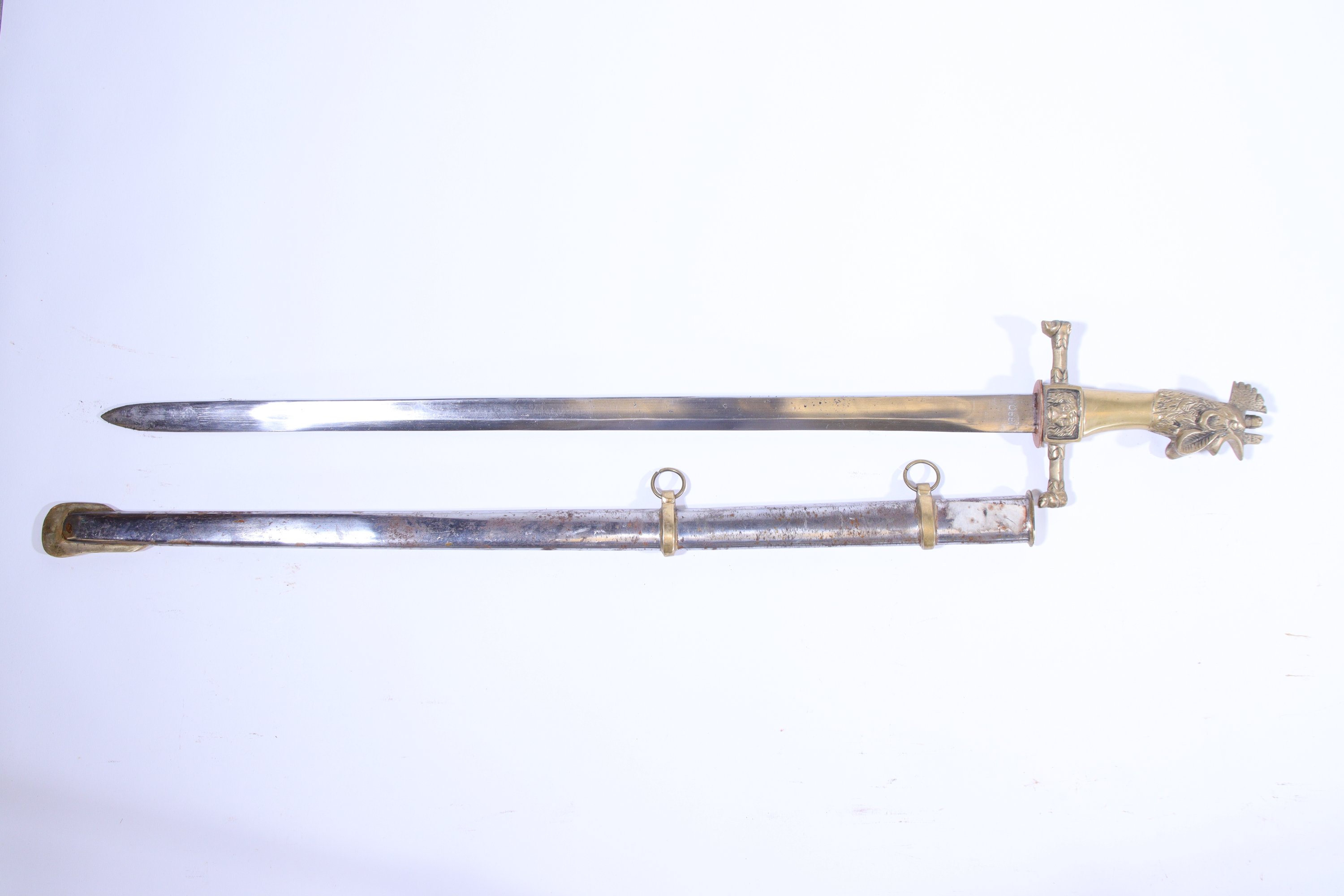 Pommeau en tête de coq, lame droite, fourreau en tôle de fer à deux garnitures en laiton.