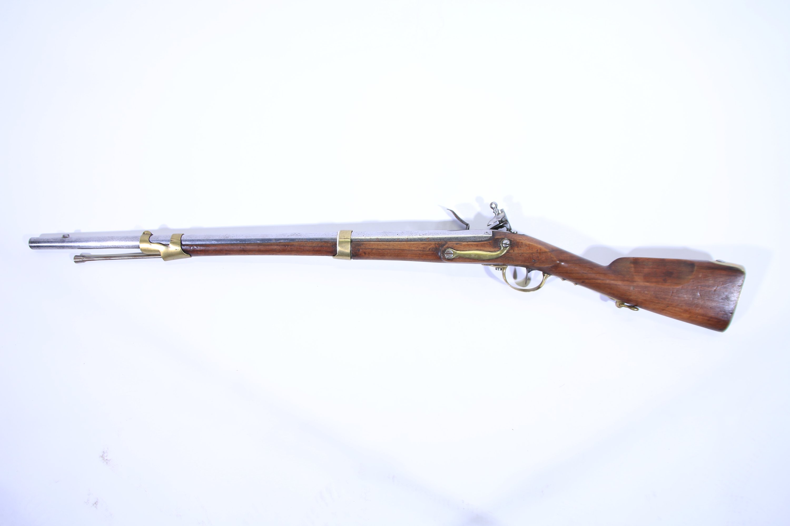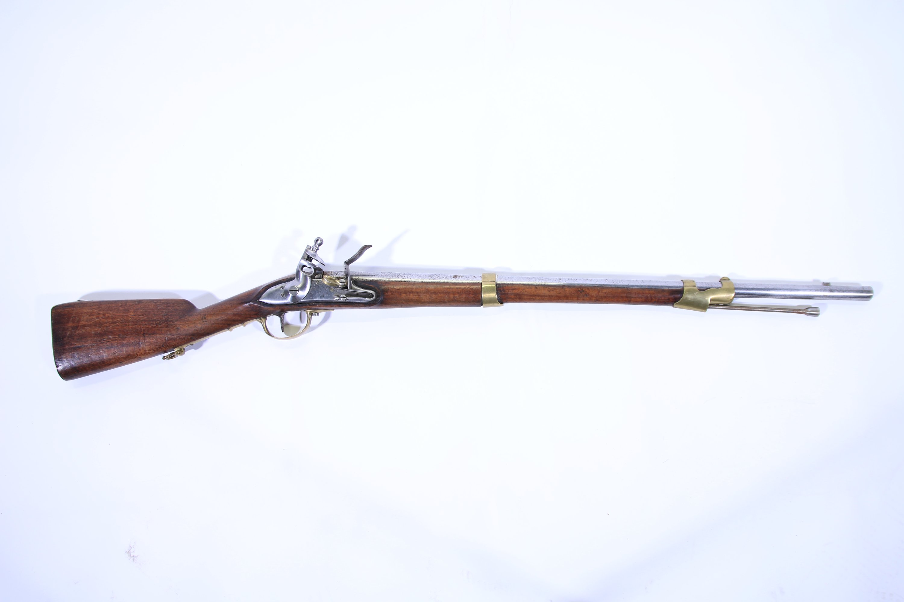 Canon rond à méplats au tonnerre, poinçonné. Platine poinçonnée H sous fleurs de lys signée « Mre Rle de Tulle » et chiens à corps rond. Garnitures en laiton (grenadière changée). Baguette en fer à embout tronconique.