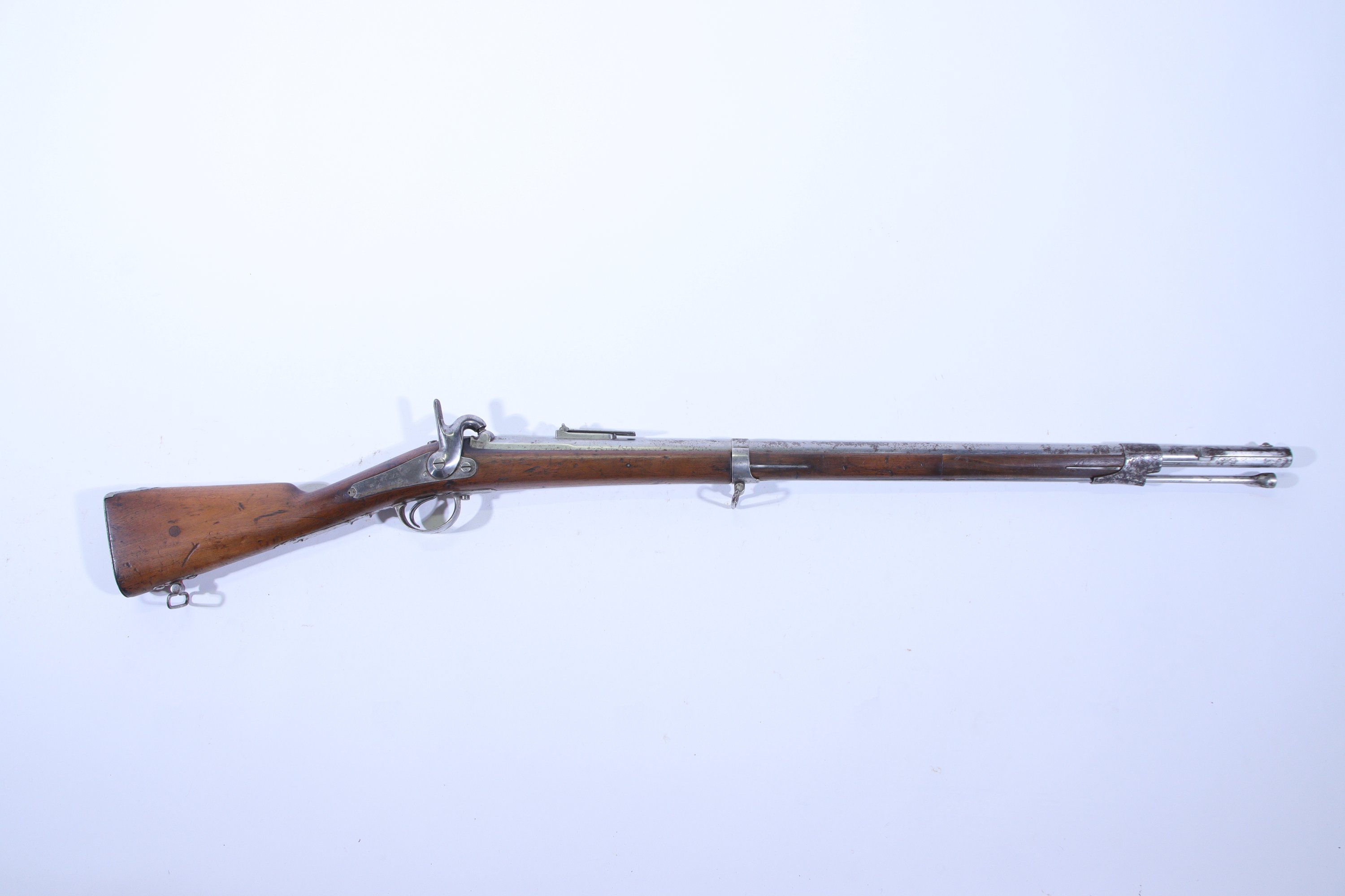 Platine « Mre Nle de Mutzig ». Garnitures en fer. Plaque de couche marquée « C » et « 6 ». Baguette à grosse tête. Crosse en noyer avec enture de 20 cm à l’avant du fût.