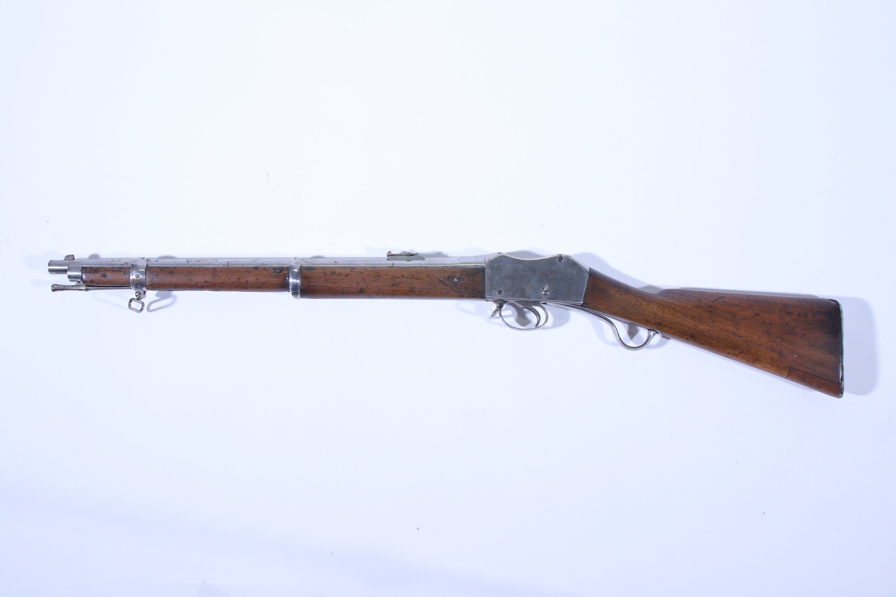 Canon rond avec hausse. Boîtier frappé « S-X » et Enfield 1872 II » Garnitures en fer. Crosse en noyer avec marquages « 1893 » et pastille « 1893 TMHA 135 »
