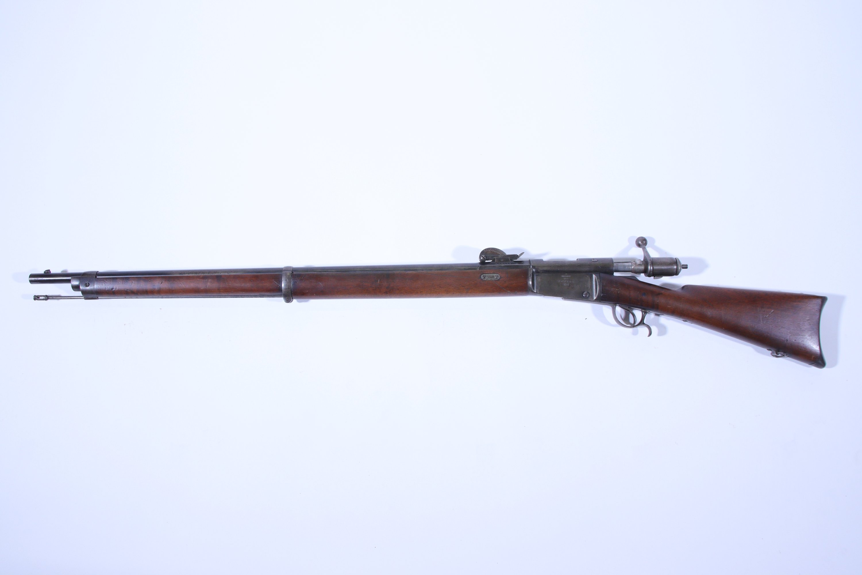 Boîtier de culasse marqué de la Waffenfabrik de Bern. Garnitures en fer poinçonné. Crosse en noyer avec marquages.