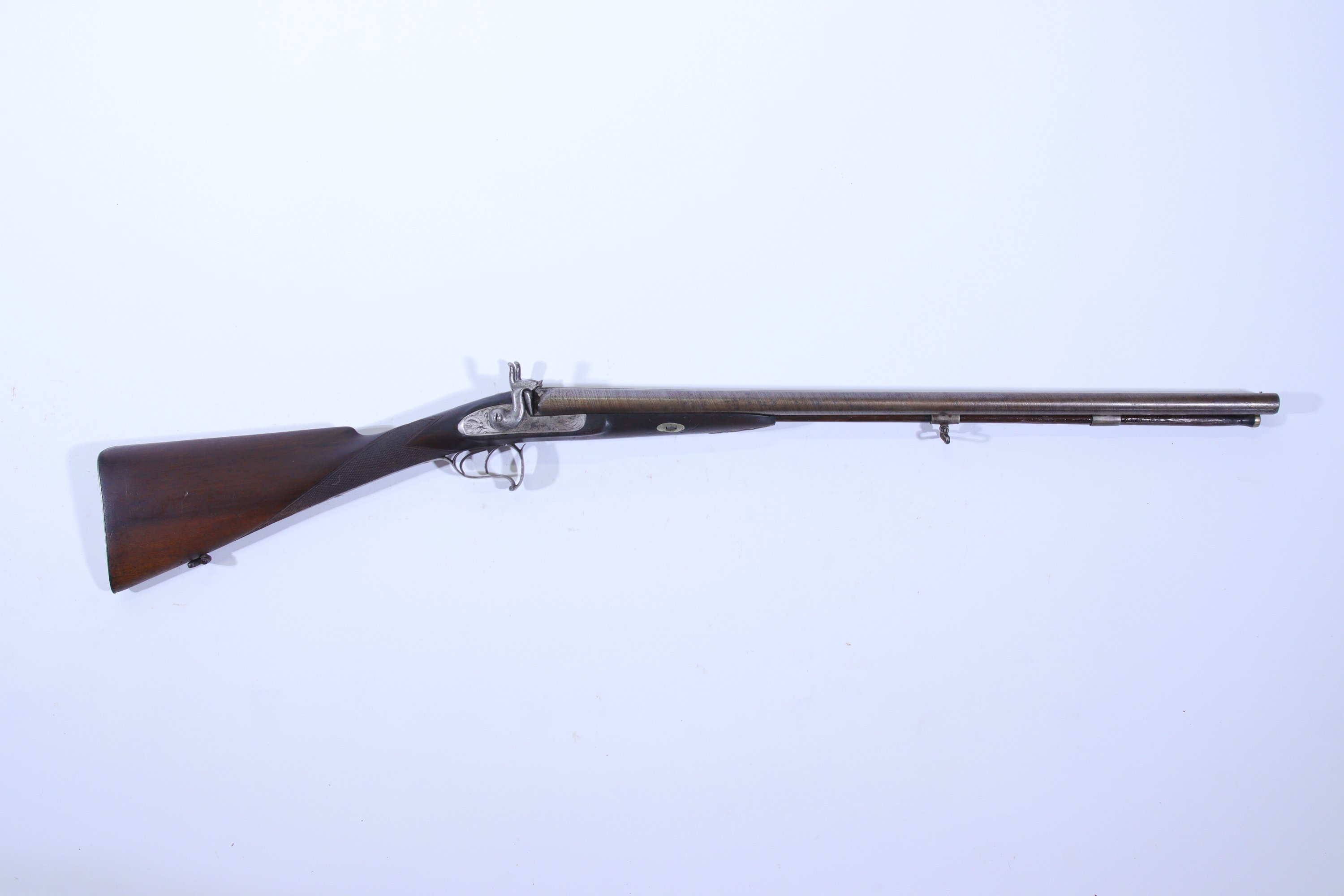 Canons en table, ruban. Platines avant et chiens ciselés. Crosse en noyer en partie quadrillée. Baguette en bois à embout laiton.