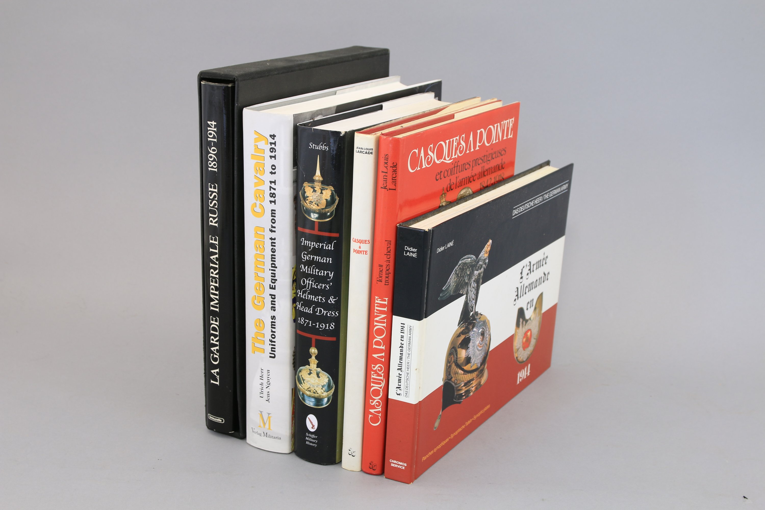 dont le « Larcade » en deux volumes sur les casques à pointe, « The german cavalry 1871-1914 » par Ferlag Militaria, la garde impériale russe, ouvrage sur les coiffures militaires allemandes.