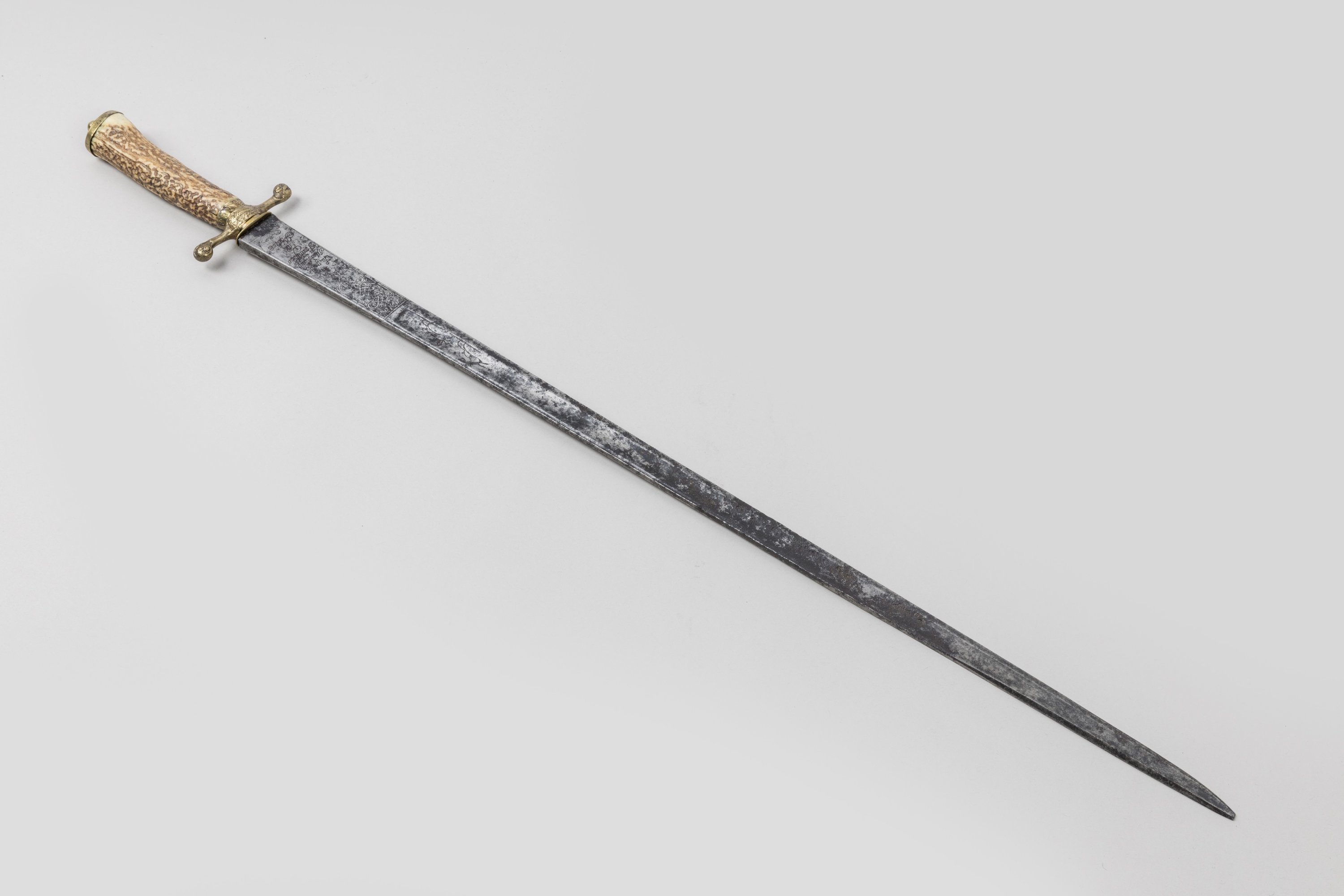 Poignée en bois de cerf. Monture en bronze doré, garde à deux quillons boulés. Lame droite à dos et pans creux gravée d'animaux et signée de "Lagarde marchand fourbisseur à Poitiers".