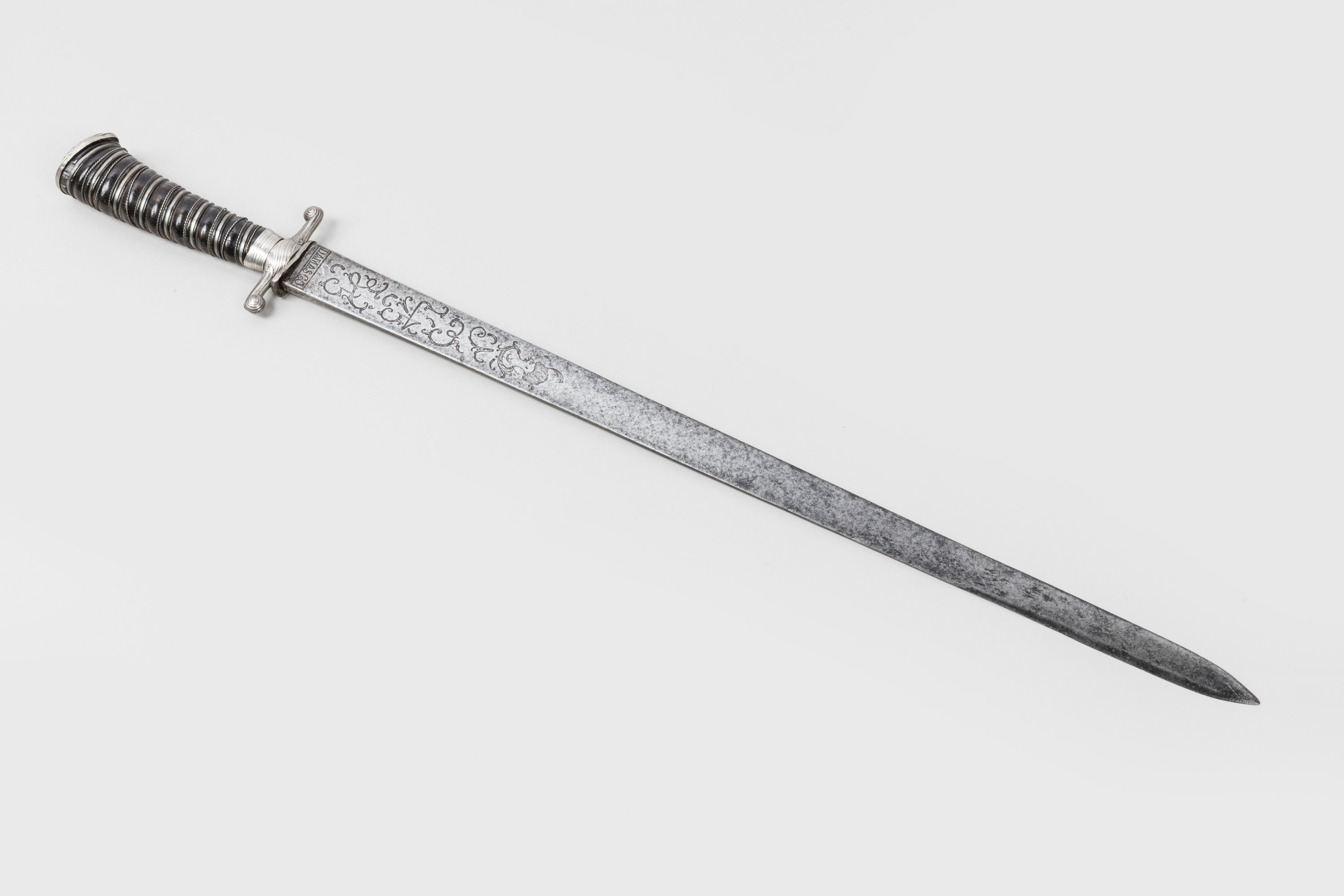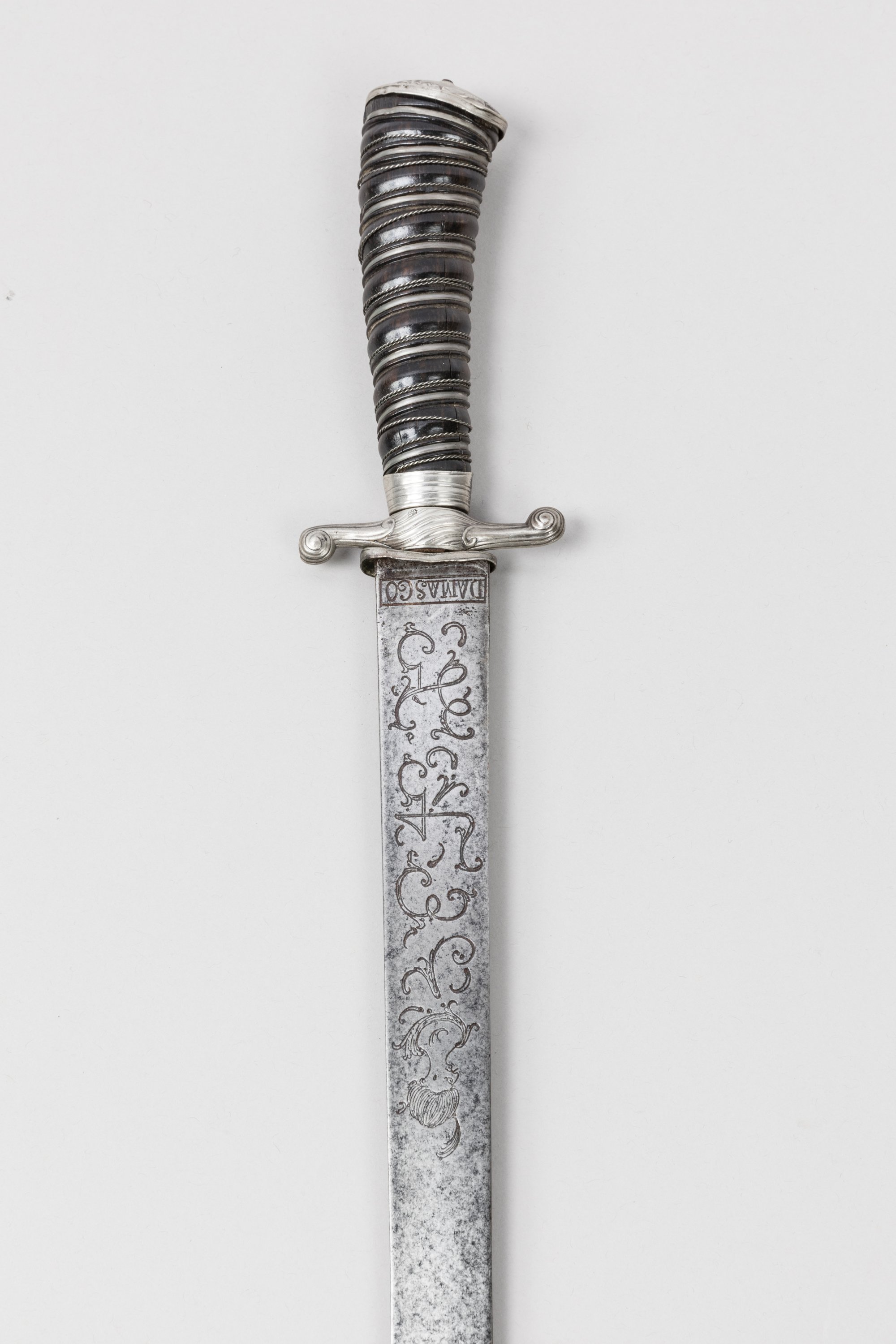 Poignée en corne noire filigranée d’argent. Monture en argent gravé et poinçonné, garde à deux petits quillons. Lame droite à la Caissaginard à dos, marquée « Damas Co », décorée d'inscriptions.
