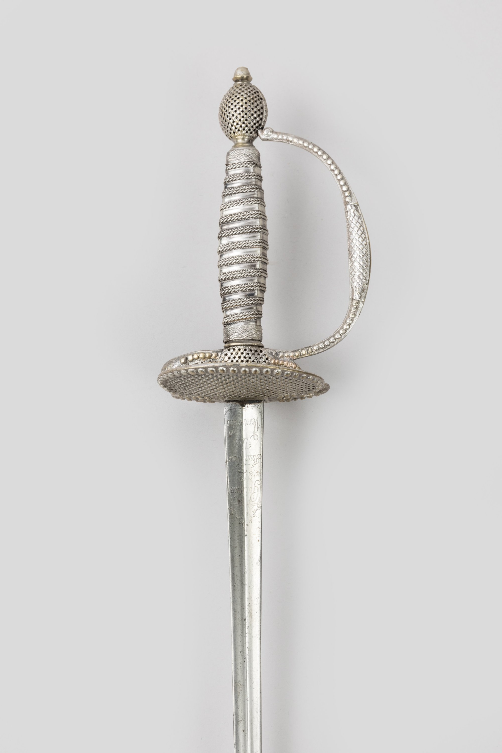 Monture en laiton argenté ciselé à pointe de diamant et repercée. Pommeau en olive, fusée filigranée et lamée. Garde à une branche, pas d’âne et coquille bivalve. Lame triangulaire signée au talon " Guilmin Md Fourbisseur à Versailles ".