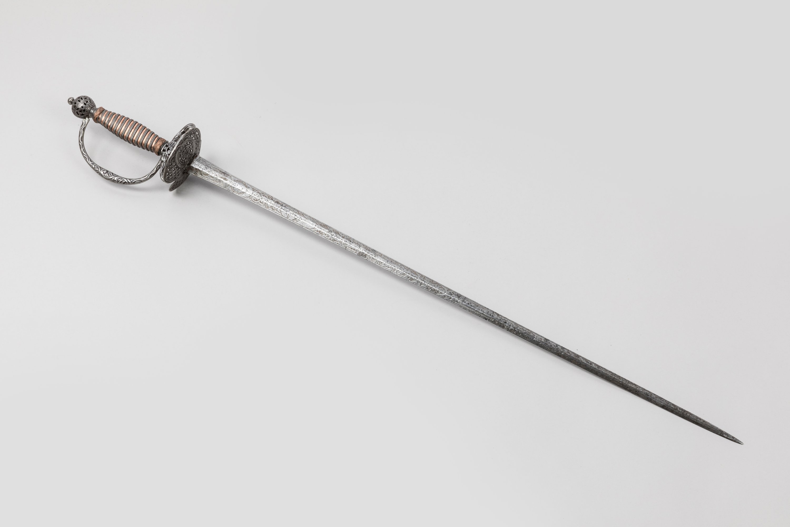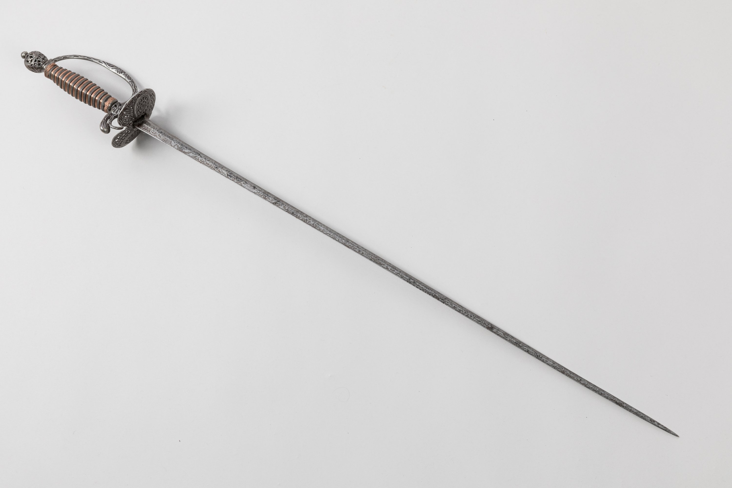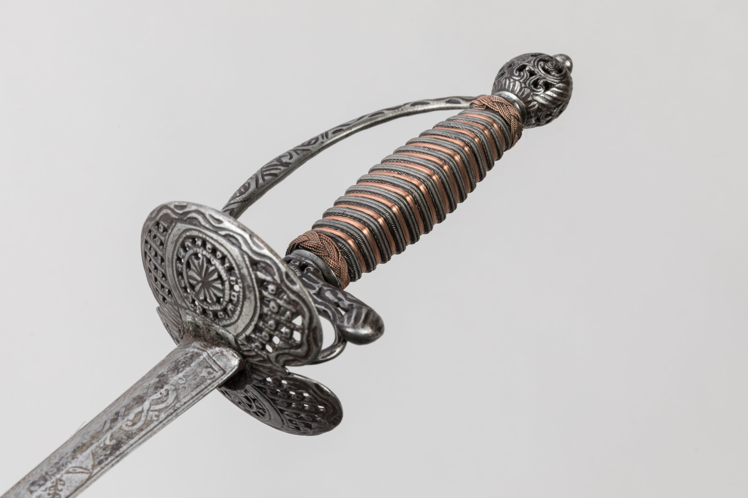 Fusée filigranée de fer et de cuivre. Monture en fer ciselé, garde à une branche, pas d’âne et coquille à jours à décor de fleurs. Lame à méplat médian entièrement gravée de médaillons, rinceaux et trophées avec restes de gravure « Soli deo ».