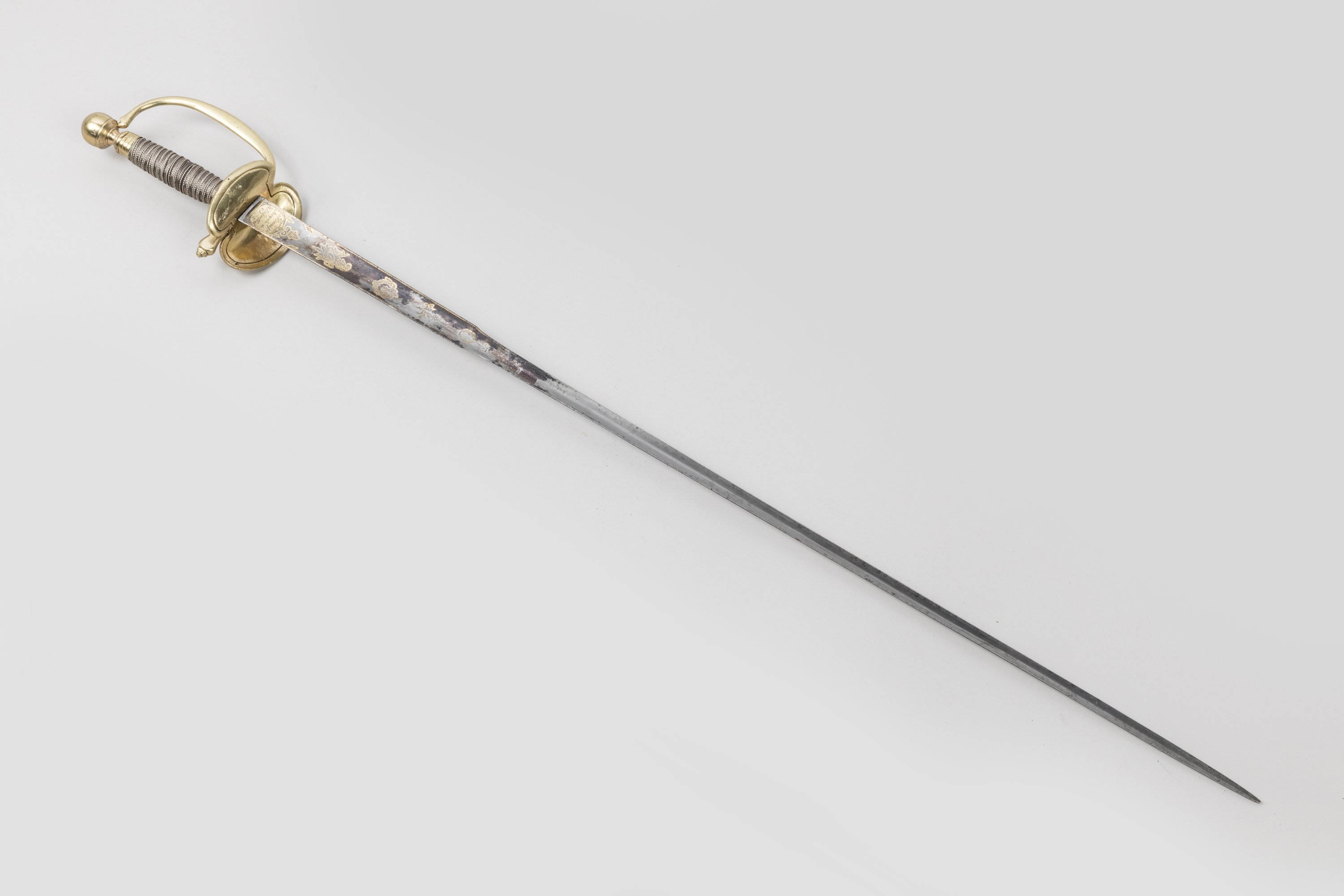Fusée filigranée d’argent. Pommeau rond à la fleur de lys, branche de garde, clavier à la fleur de lys, en laiton. Lame triangulaire à la Colichemarde de la Manufacture royale de Klingenthal, gravée, dorée et bleuie au tiers.