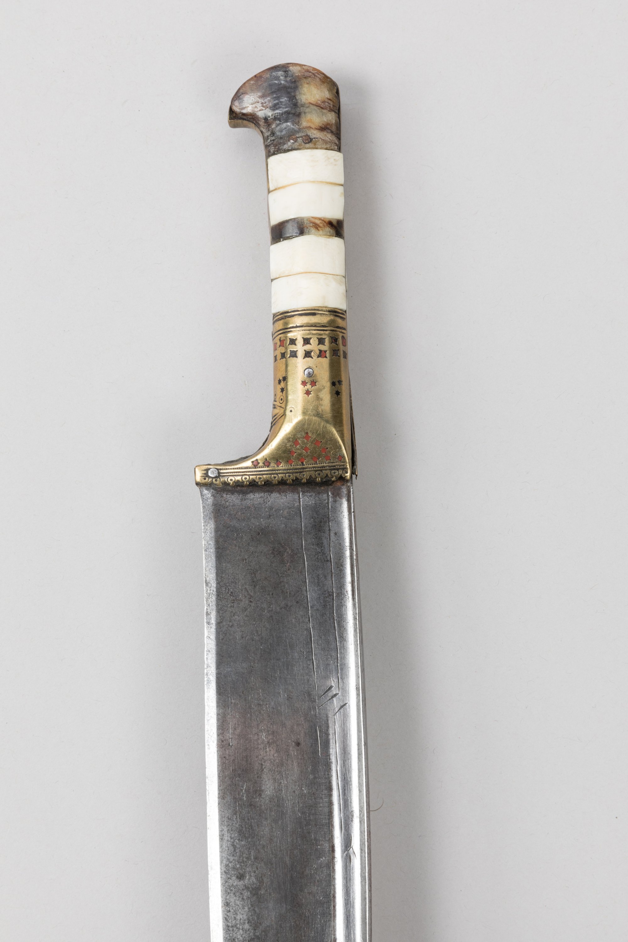 Poignée à plaquettes d’os et de corne. Monture en laiton décoré. Large lame à dos arrondi et gouttière.