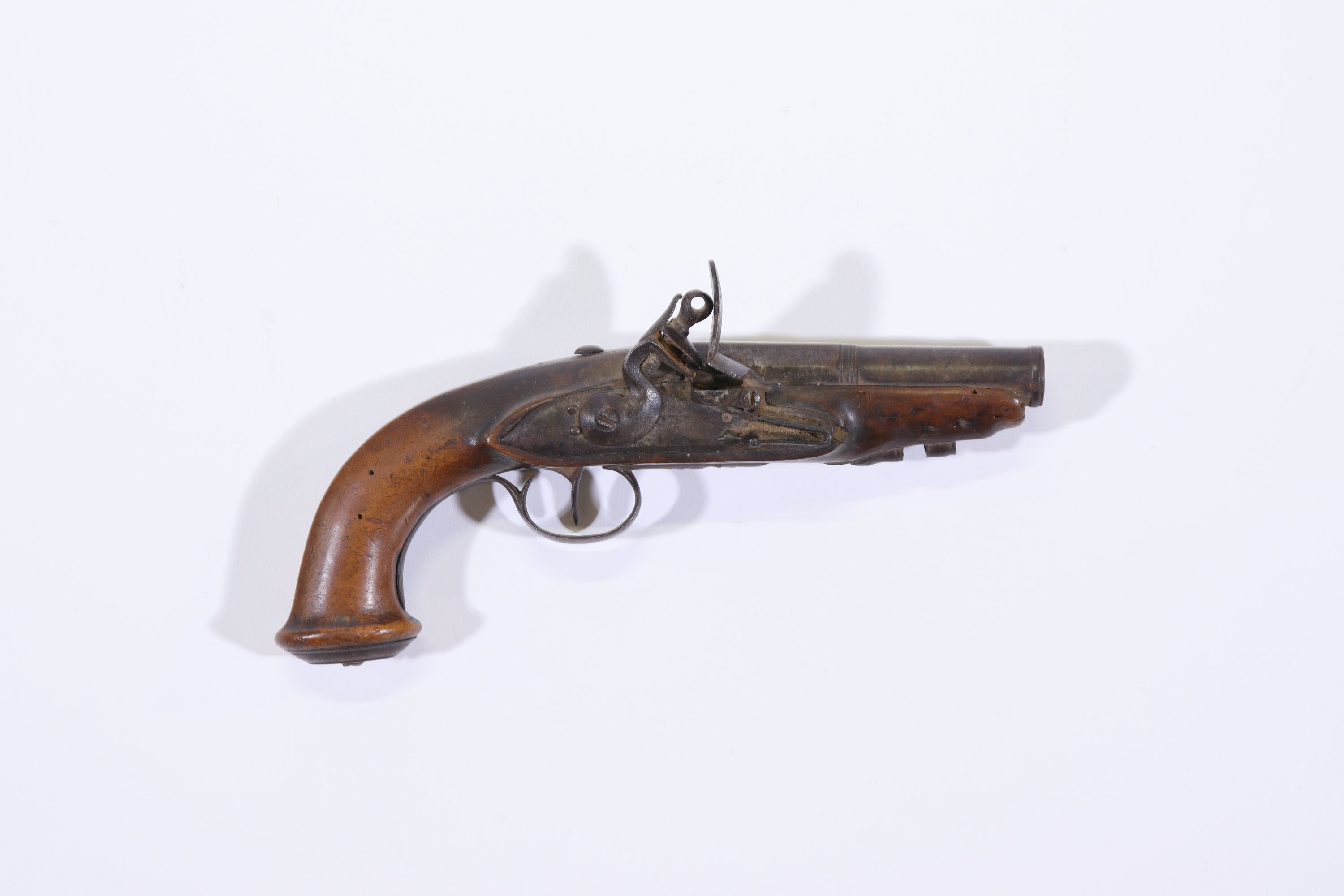 Canon rond, à pans au tonnerre. Platine et chien à corps rond. Garnitures en fer. Crosse en noyer.