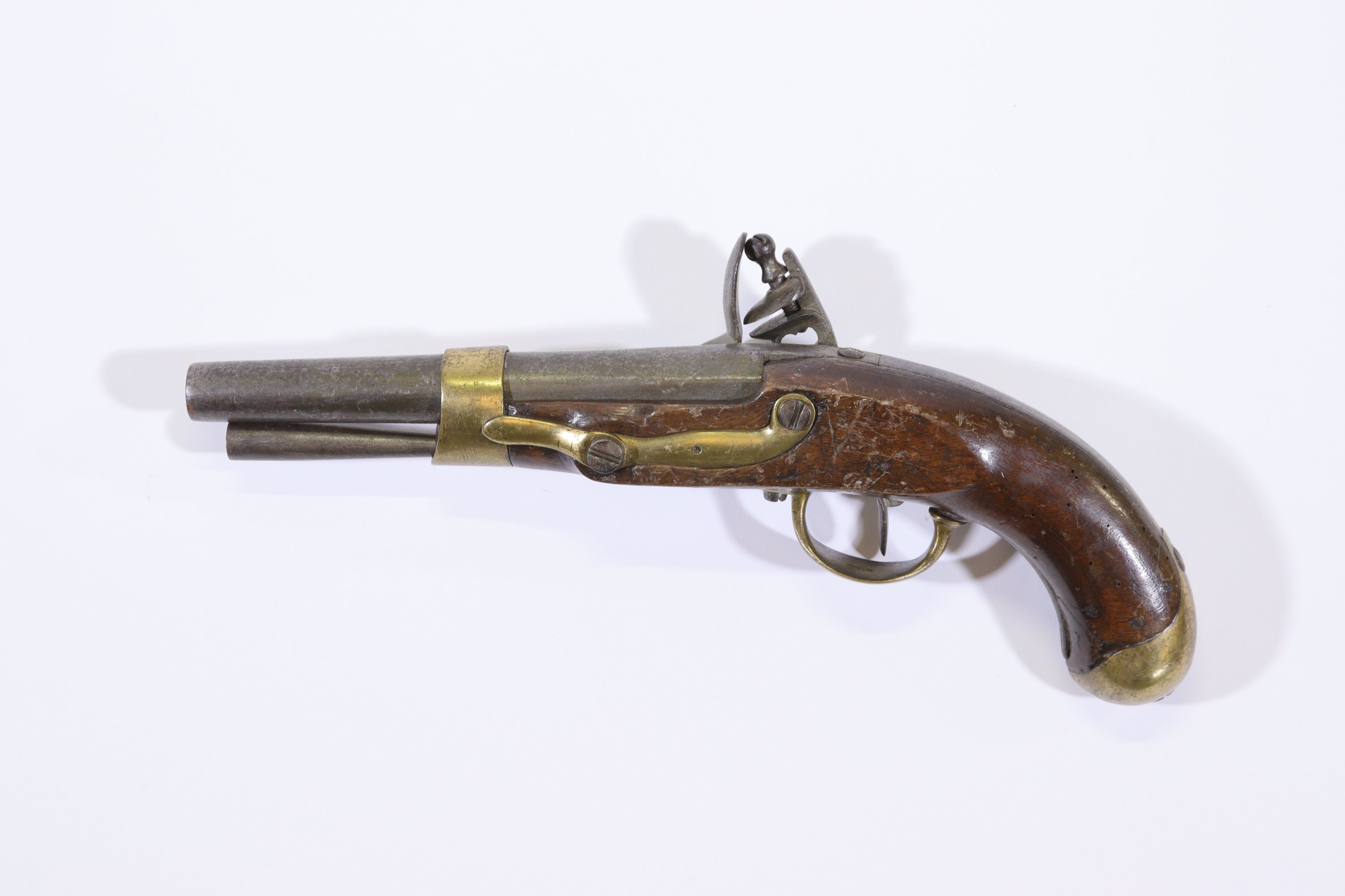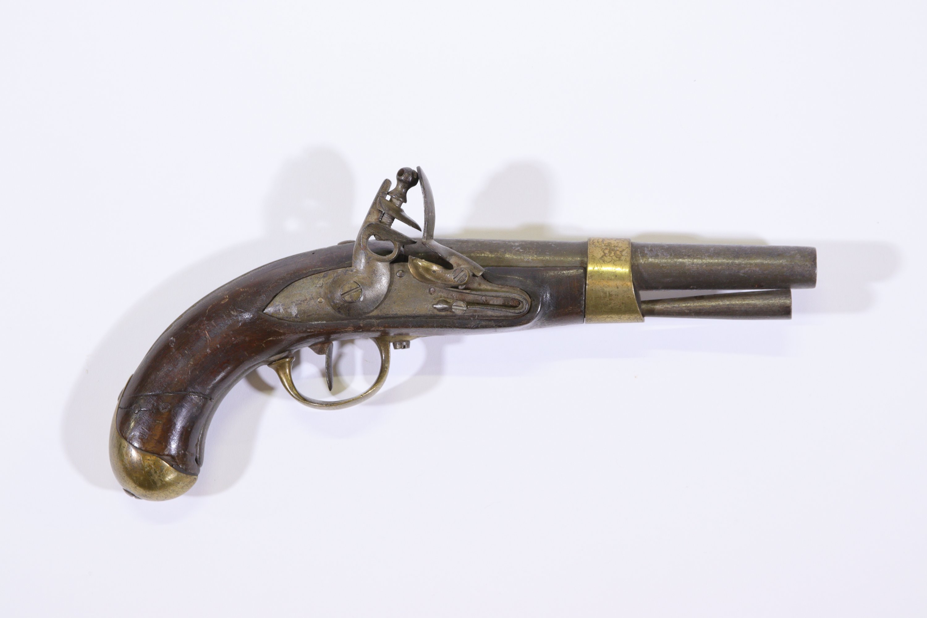 Canon rond à pans au tonnerre, non marqué. Platine vierge, chien à corps rond. Garnitures en laiton poinçonné.