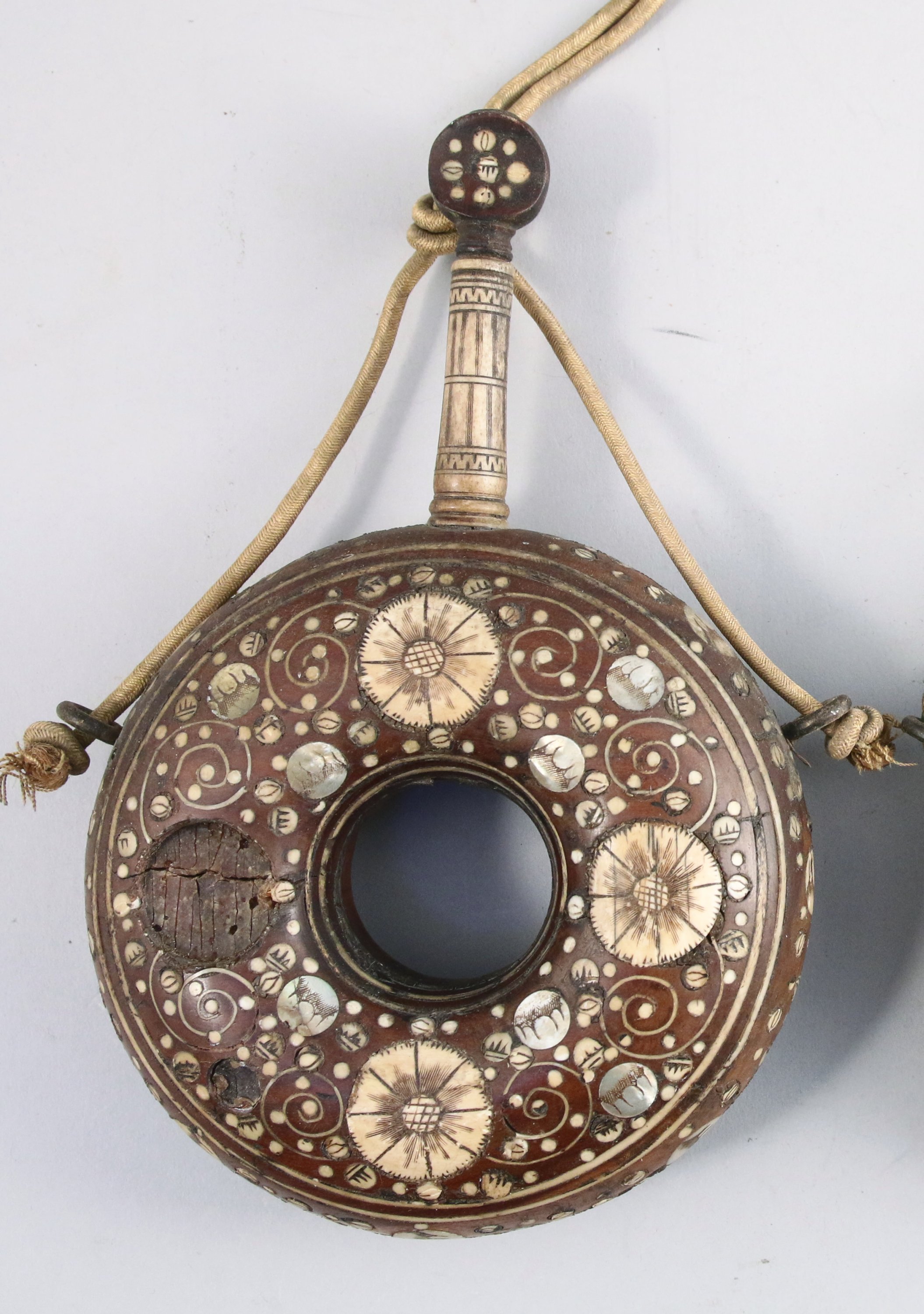 en bois fruitier, ronde, à décor d'incrustations d'os gravé et de nacre à motifs de fleurs et rinceaux.