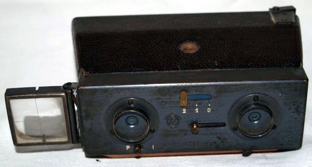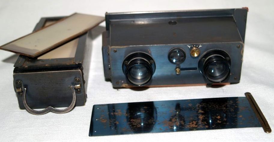 - Une visionneuse de la société Jules Richard Paris, modèle "Verascope 2a", numérotée 35397. Objectif Zeiss 8/54 mm et film en plaques 4,5 x 10,7 cm.