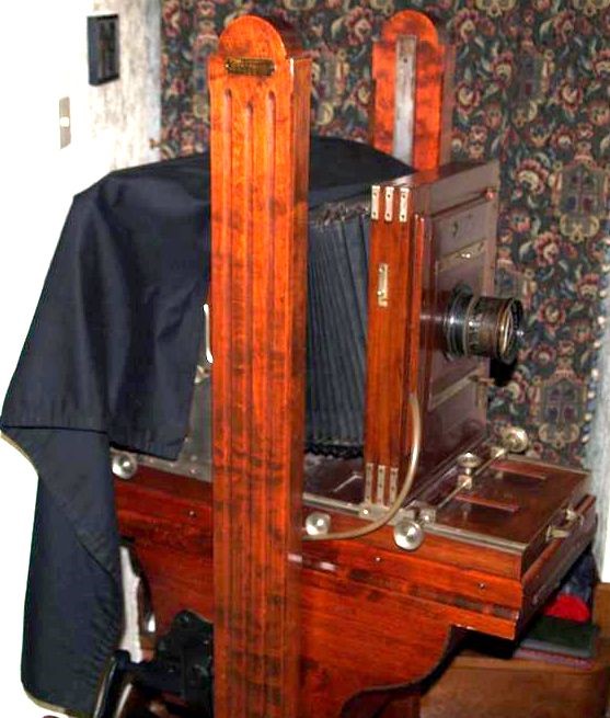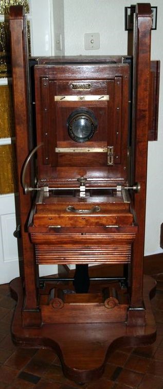 Appareil photographique à deux colonnes sur pied, vers 1930 , nombreux réglages à manivelles fonte ou laiton et autres molettes par déplacement sur crémaillères, format maximum 24 x 24 cm, objectif « Hermagis anastigmate Dellor 4,5/310 mm n°160 608 .