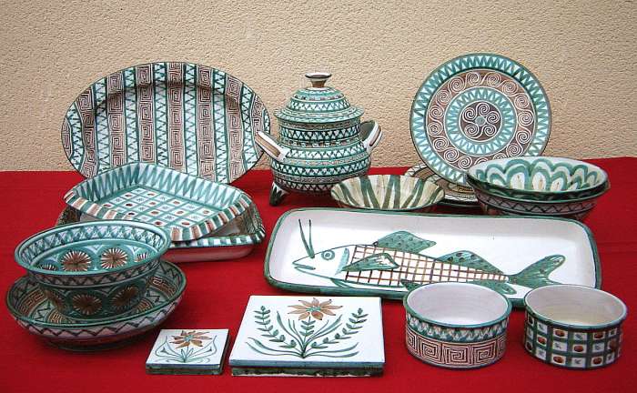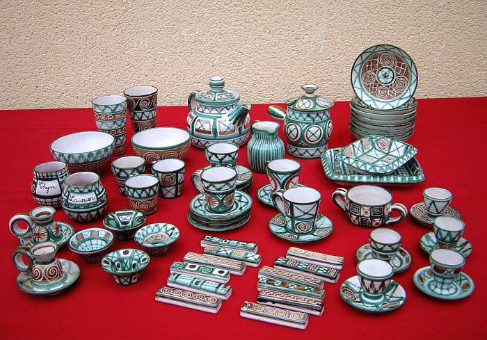 VALLAURIS. Robert PICAULT. SERVICE DE TABLE à décor peint en vert et manganèse sur émail stannifère, 128 pièces : 18 assiettes, 9 assiettes creuses, 13 assiettes à dessert, assiette à lunch, 8 coupelles, 9 poëlons, 5 coquetiers, 7 tasses à café et 8 soucoupes, 2 mazagrans, pot à lait, pot à deux oreilles, chocolatière et son couvercle, théière et son couvercle, sucrier et son couvercle, pot à eau, 2 bols, 2 pichets à eau, chevrette à vin, 4 plats rectangulaires, 4 plats ronds, plat ovale, plat à poisson, 4 saladiers, 2 soupières et leurs couvercles, 2 bougeoirs, 12 portes-couteau, 6 petits pots, pot à queue, 2 carreaux porte-bouteille, 2 dessous de plat carrés, terrine et son couvercle, compotier, coupe à fruits. (qqs éclats et fêles)
