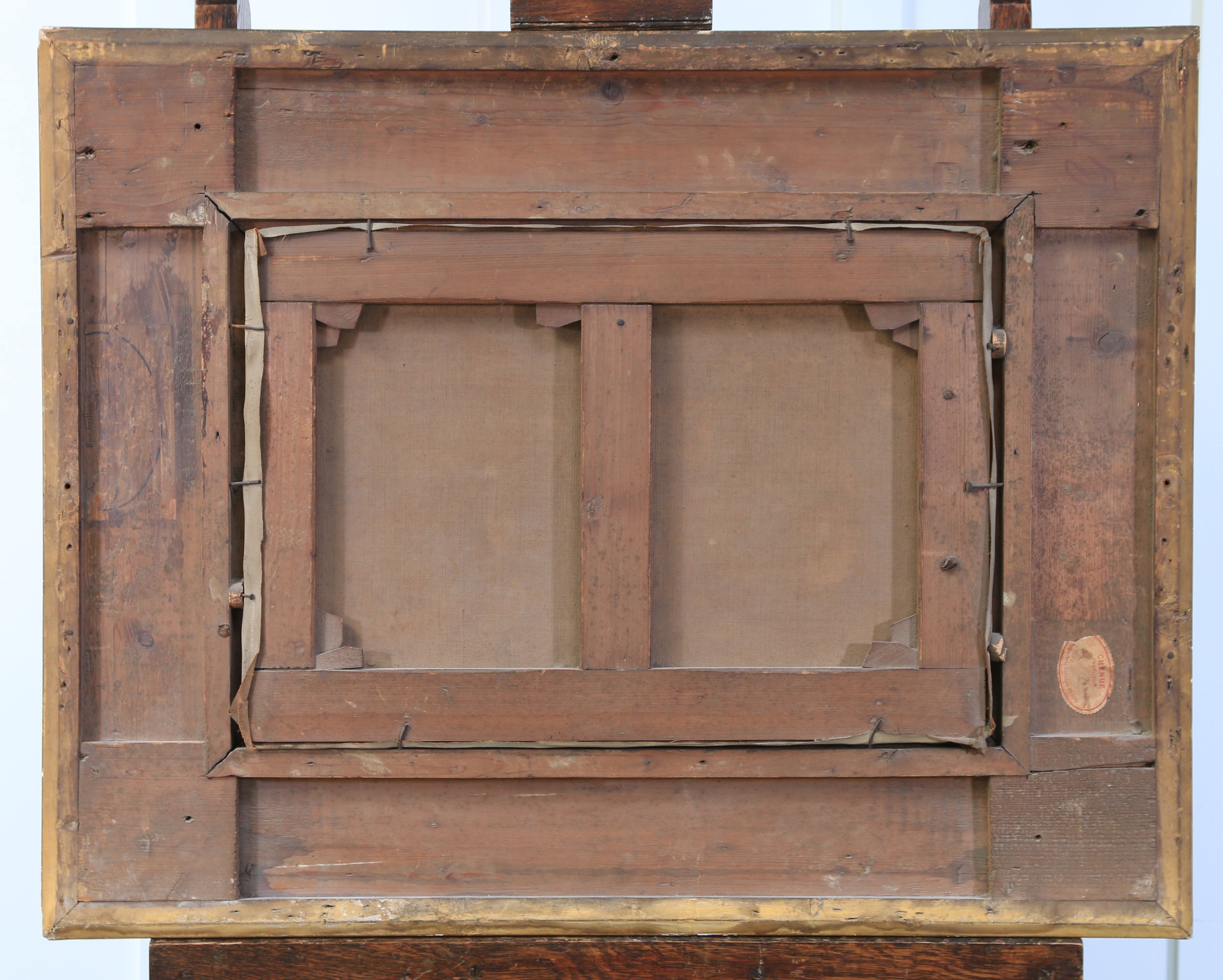 Cadre en bois et stuc doré (Haut. 64 Prof. 80 cm, accidents et manques).