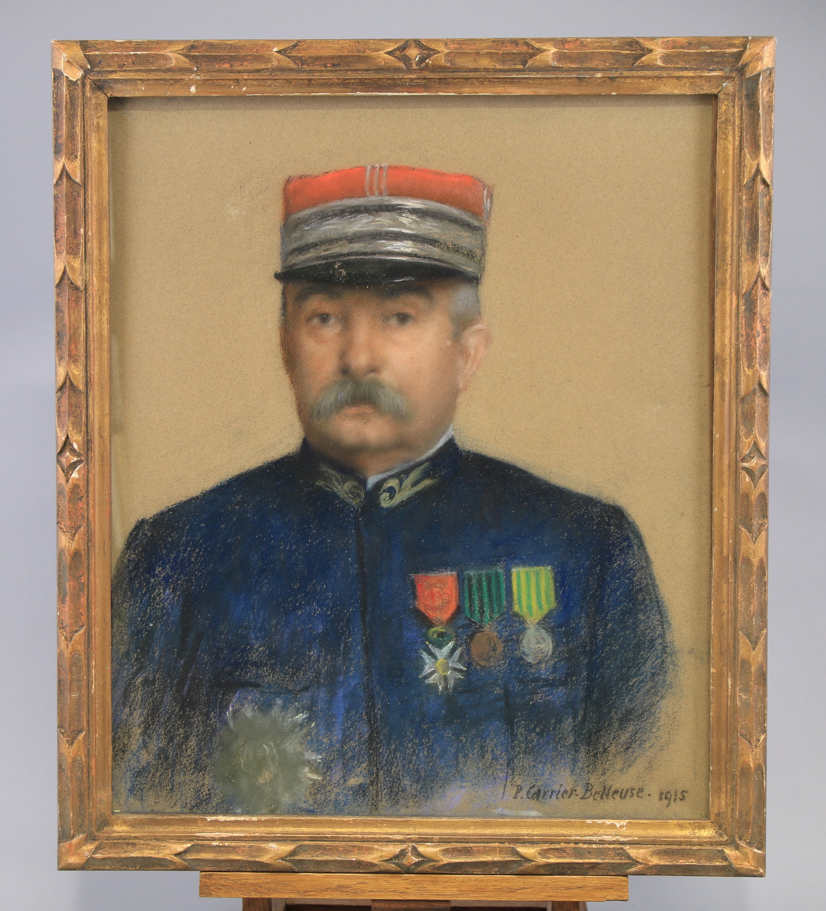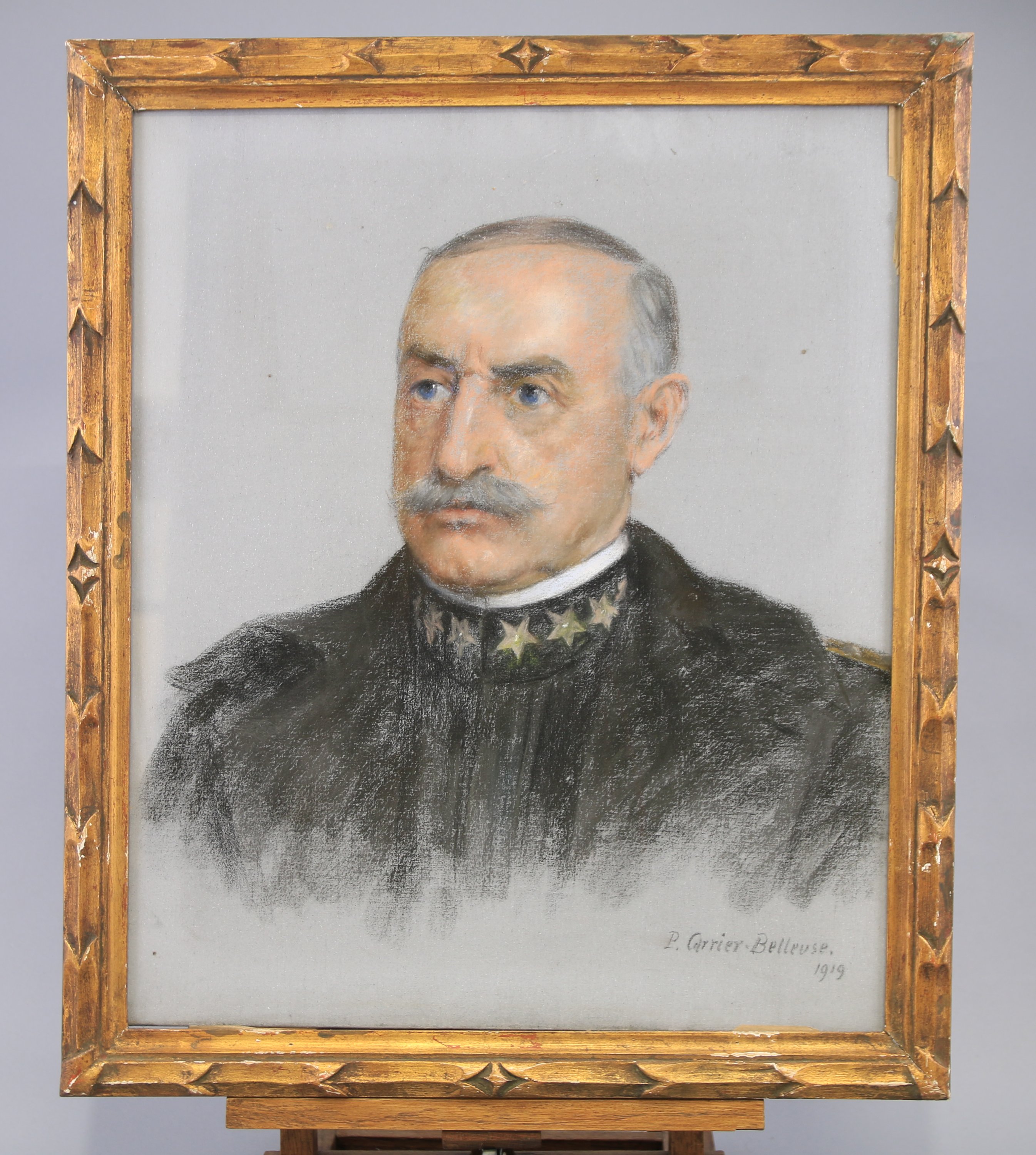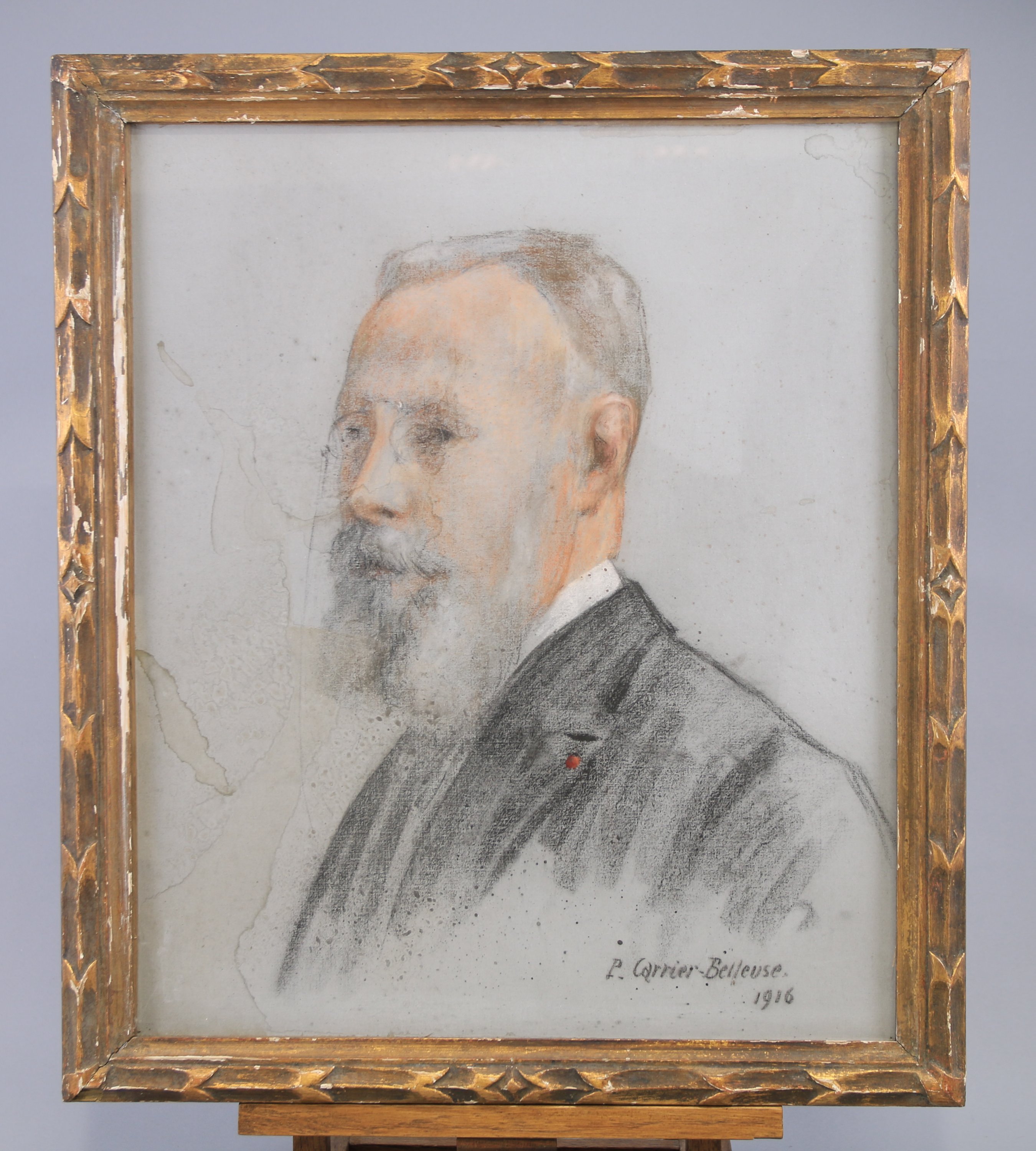 Nos six portraits par Pierre Carrier-Belleuse sont tirés du "Panthéon de la guerre", recensant les traits d'environ 6.000 personnages. "D'innombrables portraits, beaucoup d'après nature, d'autres d'après photographies et les documents envoyés par les familles, sont là sur une toile d'un développement de 120 mètres, d'une hauteur de 15". Ce projet pharaonique débute en octobre 1914 et se termine en novembre 1918. L'oeuvre finale se présente comme le plus grand tableau du XXe siècle, réalisé en collaboration avec Auguste François-Marie Gorguet, avec la participation d'environ 130 artistes. Exposé près des Invalides dans un bâtiment détruit depuis les années 1960, le tableau est admiré par 3 millions de visiteurs entre 1918 et 1927. Il est ensuite acquis par des Américains qui l'exposent au Madison Square Garden avant de l'envoyer en tournée dans tous les Etats-Unis. Le "Panthéon de la Guerre" est aujourd'hui exposé au Mémorial de la Liberté à Kansas City mais a vu ses dimensions considérablement réduites pour mettre en valeur la participation américaine au premier conflit international mondial.