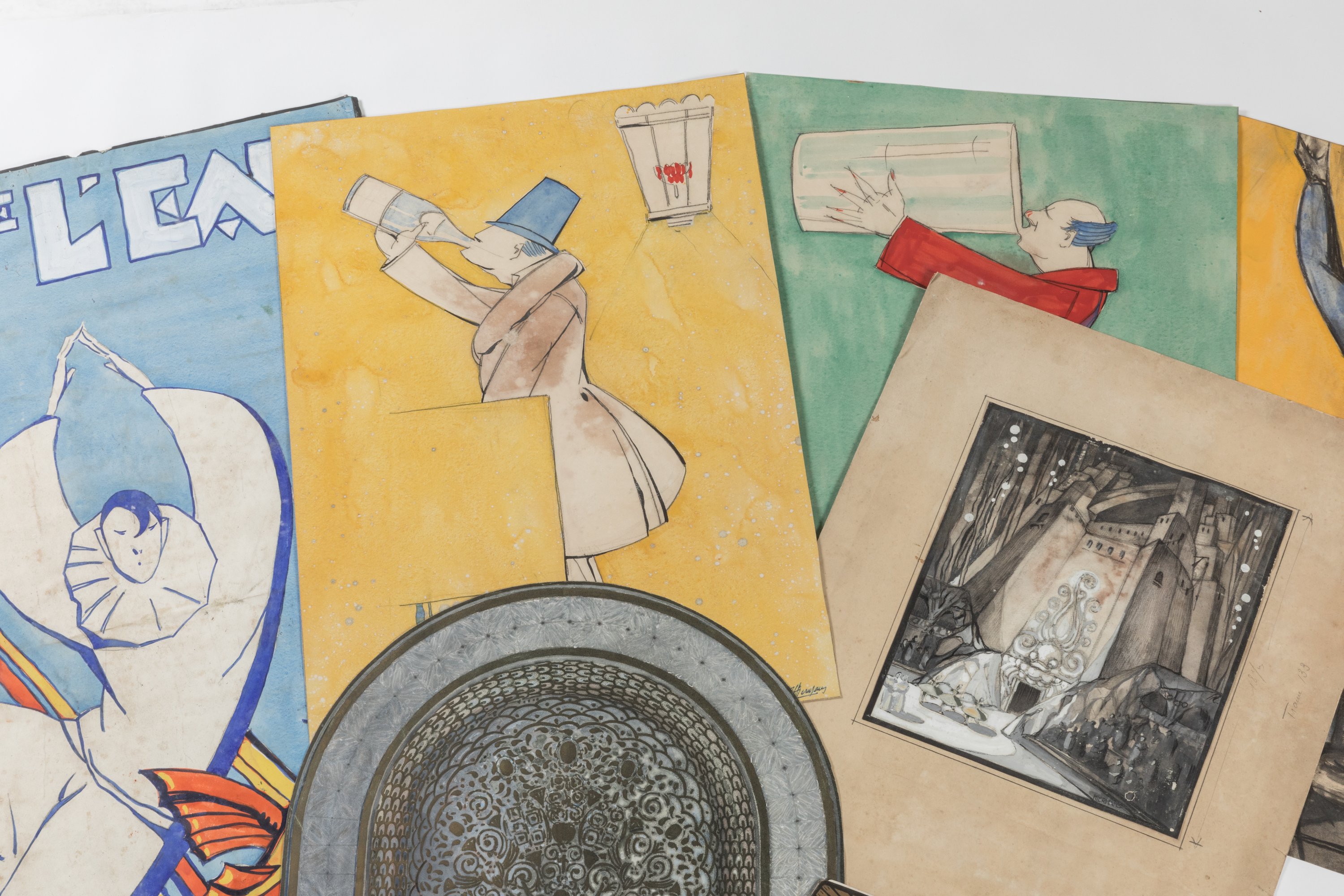 - Maquette pour la Fête de l'Eau. Fusain, encre et gouache sur papier. Signé en bas à droite. Indications manuscrites "Trame 133" et "18f" sur papier fort. Haut. 33,5 Larg. 29 cm (trous, déchirures, tache, contrecollé sur papier). Sans cadre. Bibliographie : Maison des Journalistes, Livret de la Fête de l'Eau du 7 juillet 1923, p. 11 ;
