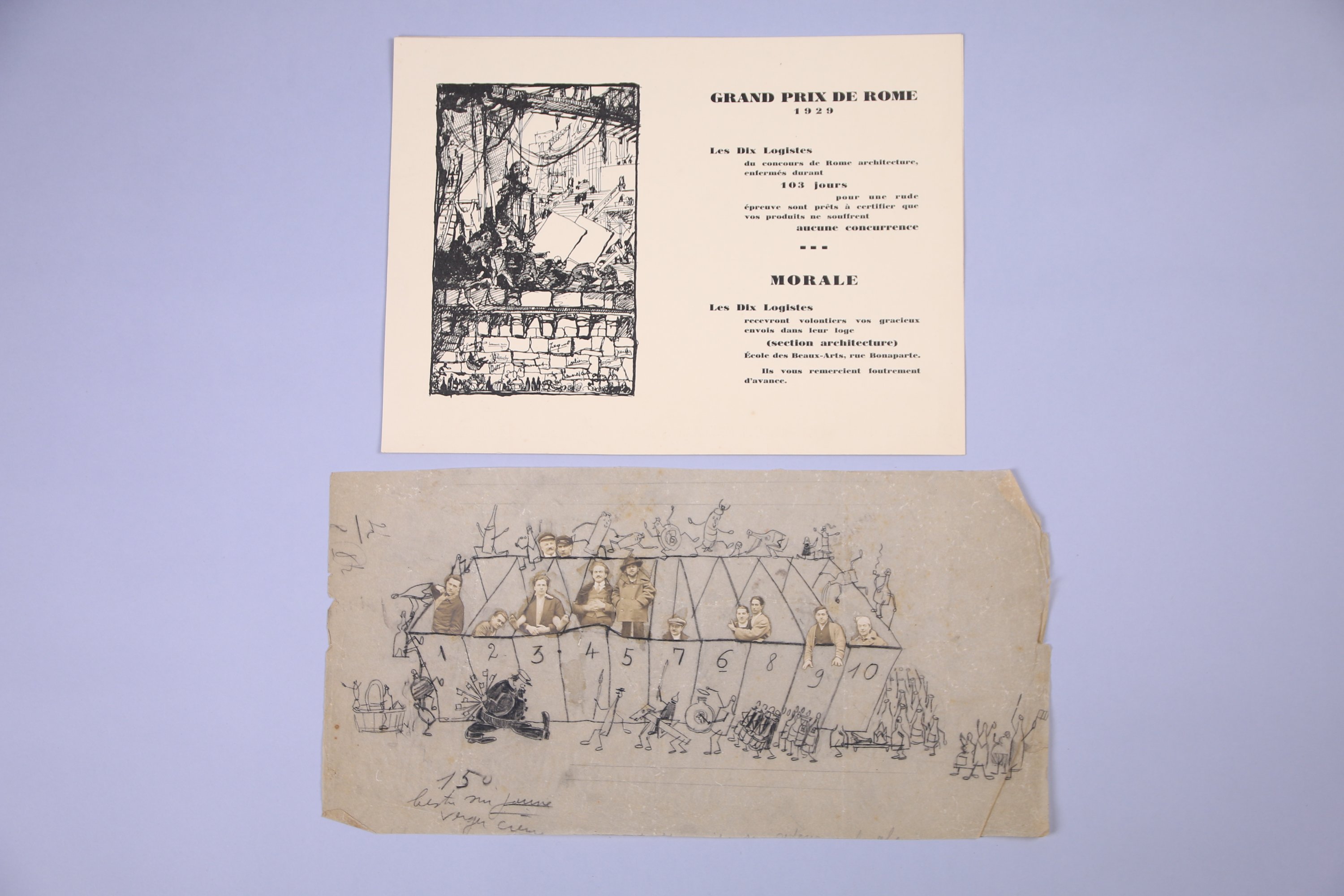 - Ecole du XXe siècle, Les 10 logistes du Prix de Rome 1929, fusain sur calque et photographies collées, indication manuscrite "15° / liste sur...". Haut. 23 Larg. 45,5 cm (pliures, déchirures) ;