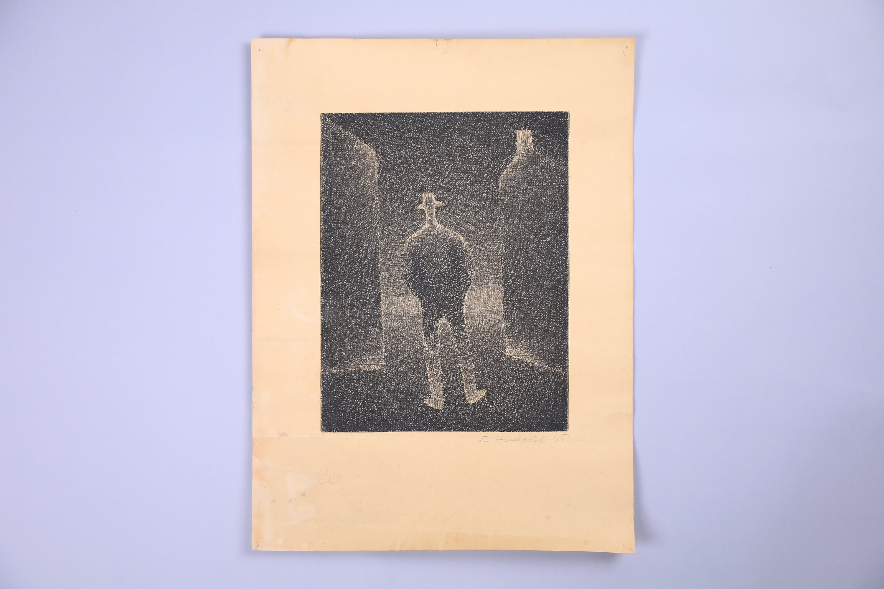 - Frantisek Hudecek (Tchèque, 1909-1990) Nocni Chode, 1945. Eau-forte signée et datée au crayon en bas à droite. Cachet sec en bas à gauche dans la marge. L'image : Haut. 29,5 Larg. 23 cm. La feuille : Haut. 47 Larg. 35 cm (pliures) ;