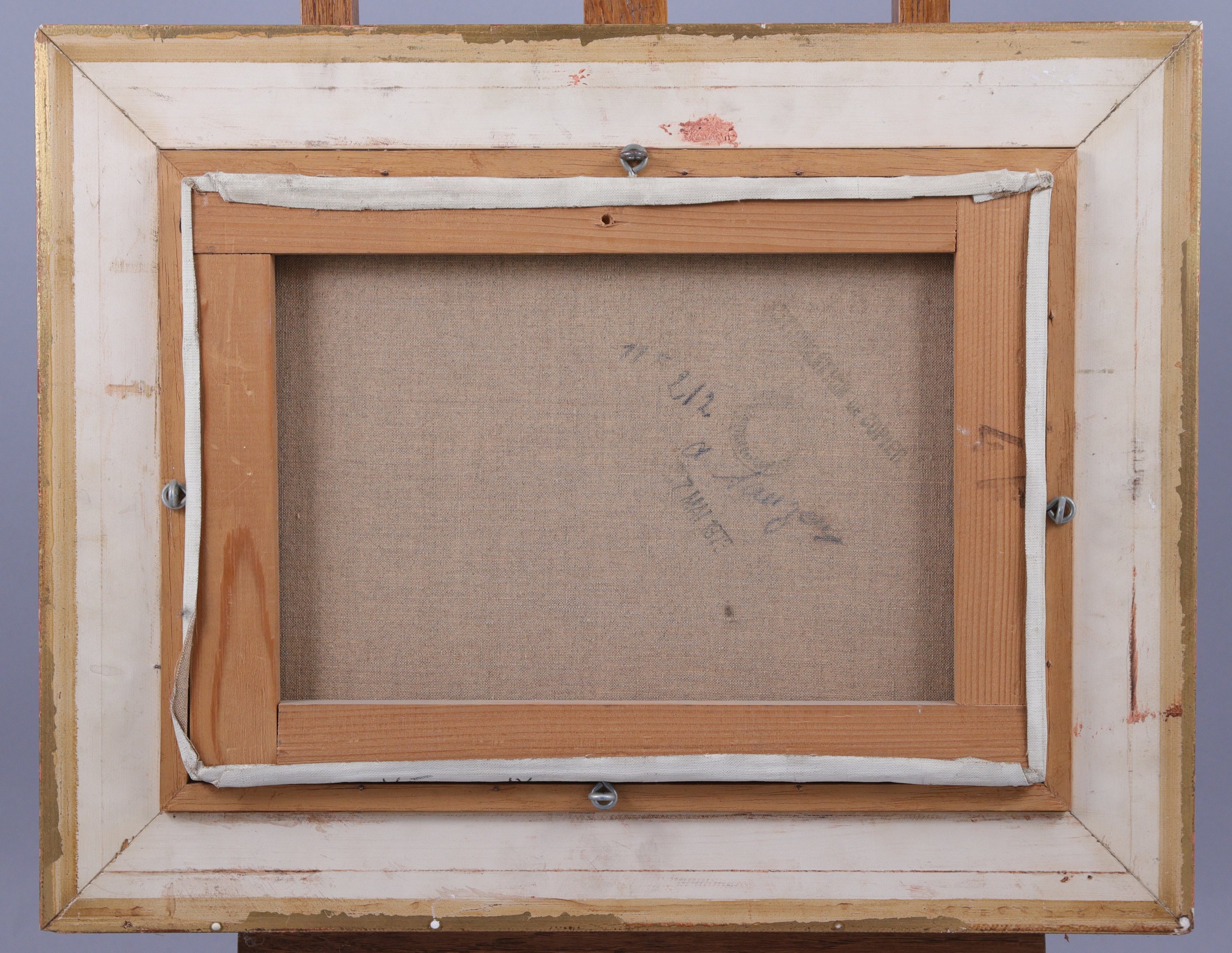 - Attribué à Amélie Sauger (Française, -1951), Paysage. Toile. Marquée à l'encre au dos "A.Sauger / n°212". Haut. 23,2 Larg. 33 cm. Cadre en bois doré à décor de godrons (Haut. 35 Larg. 45 cm).