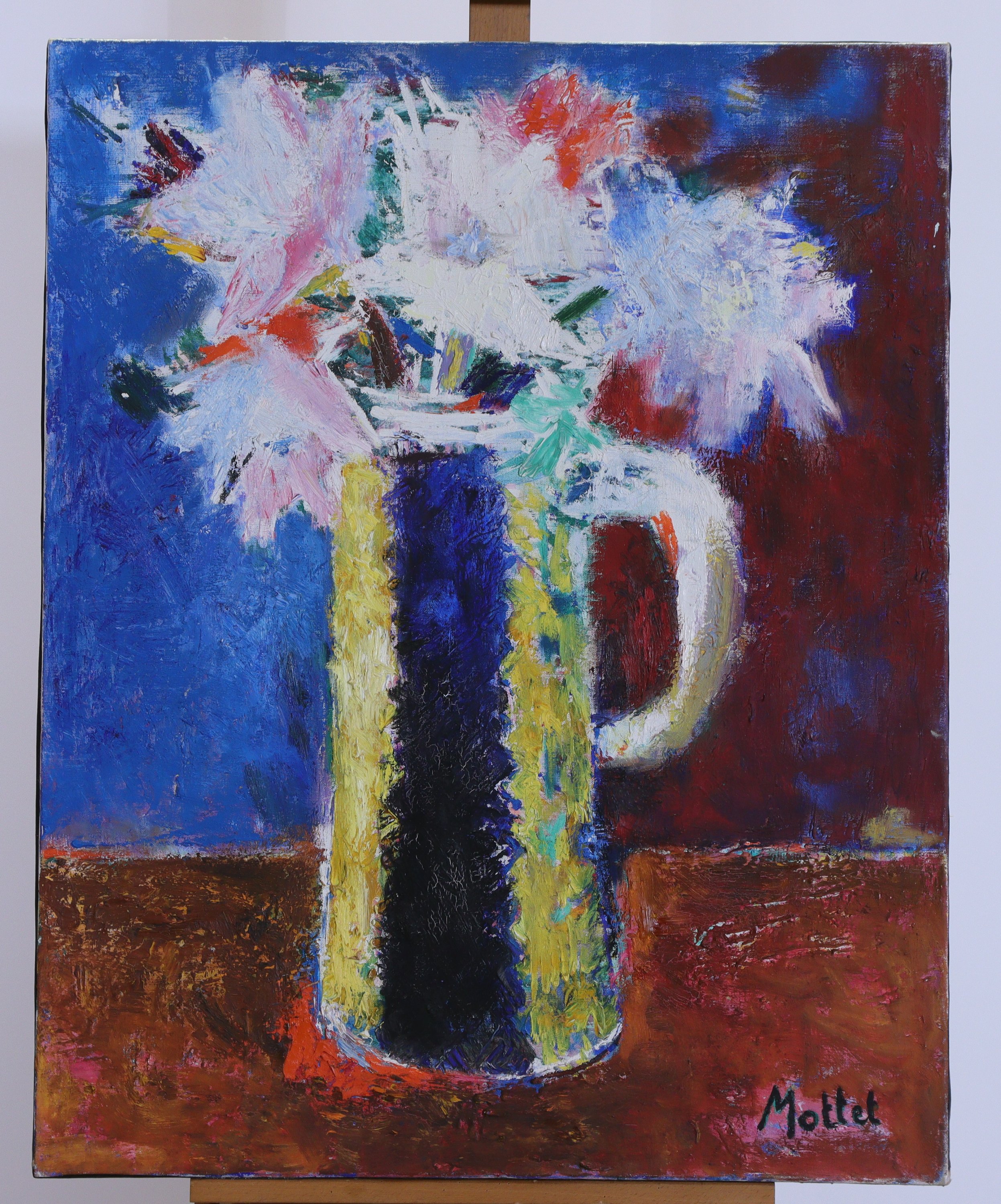 Signée en bas à droite. Etiquette manuscrite collée au dos « n°8 / Bouquet au pot bleu et jaune / 30 F. ».