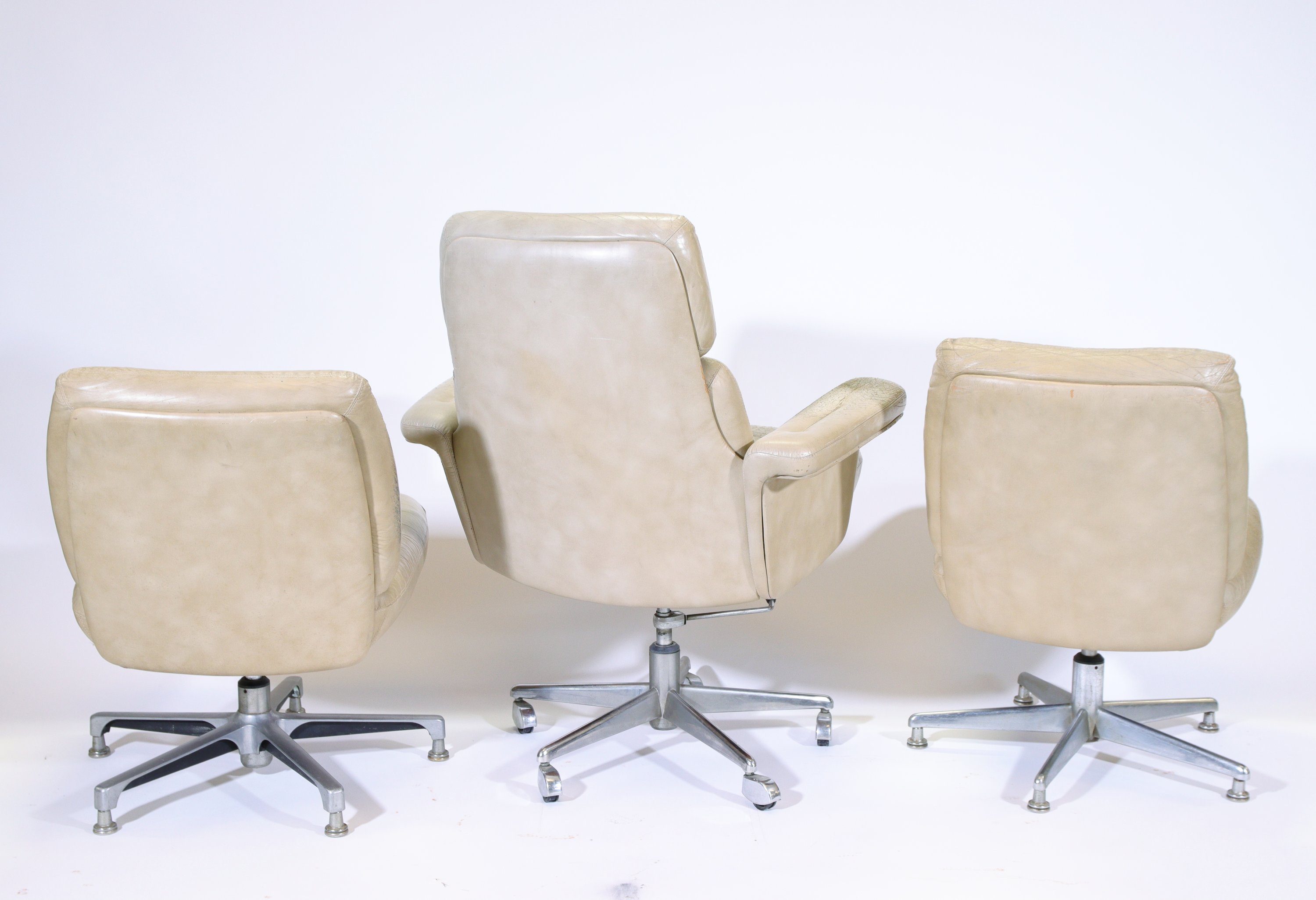 en skaï beige et piétement en métal chromé de forme étoilée. Le fauteuil à roulettes réglable en hauteur.