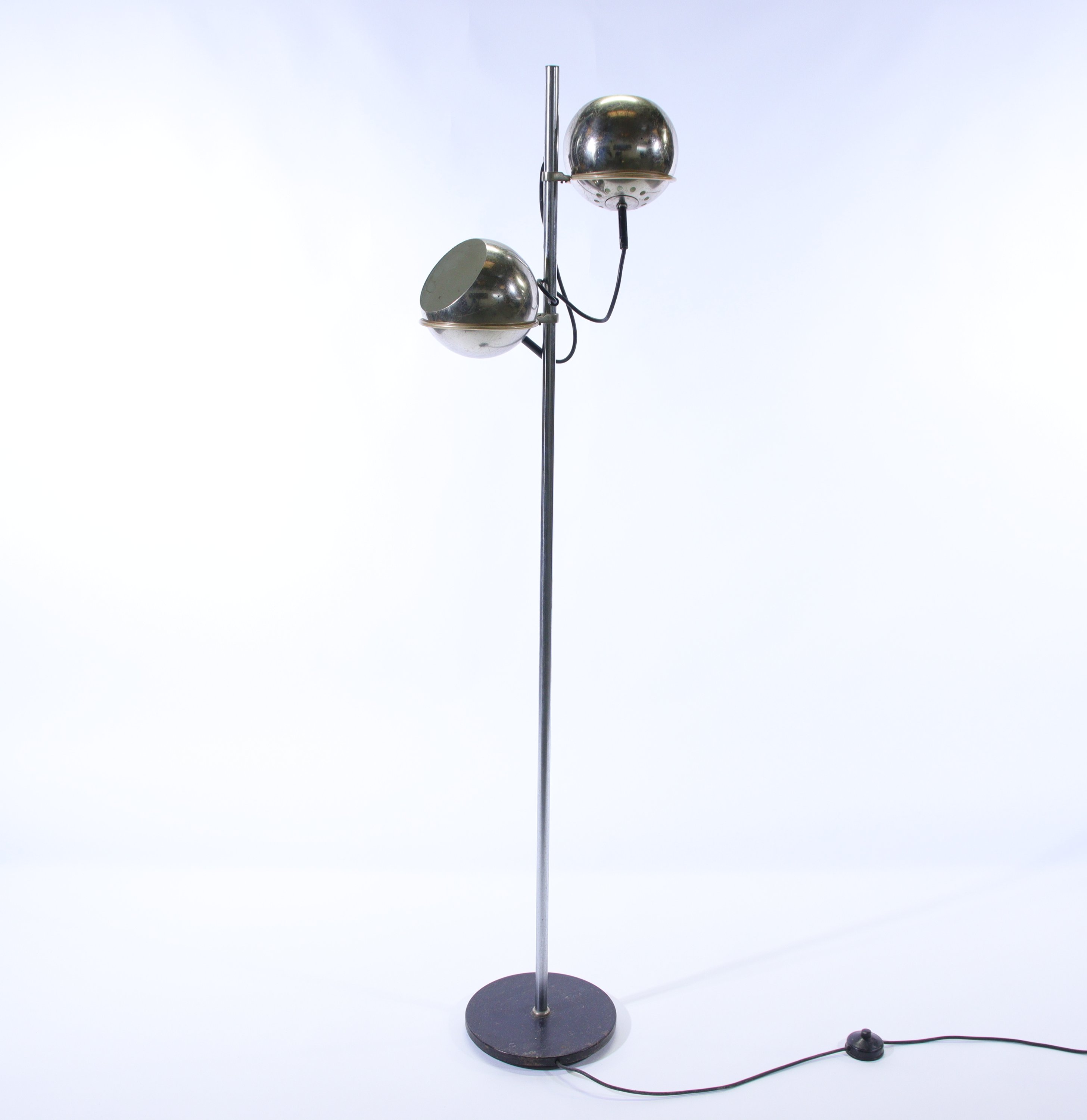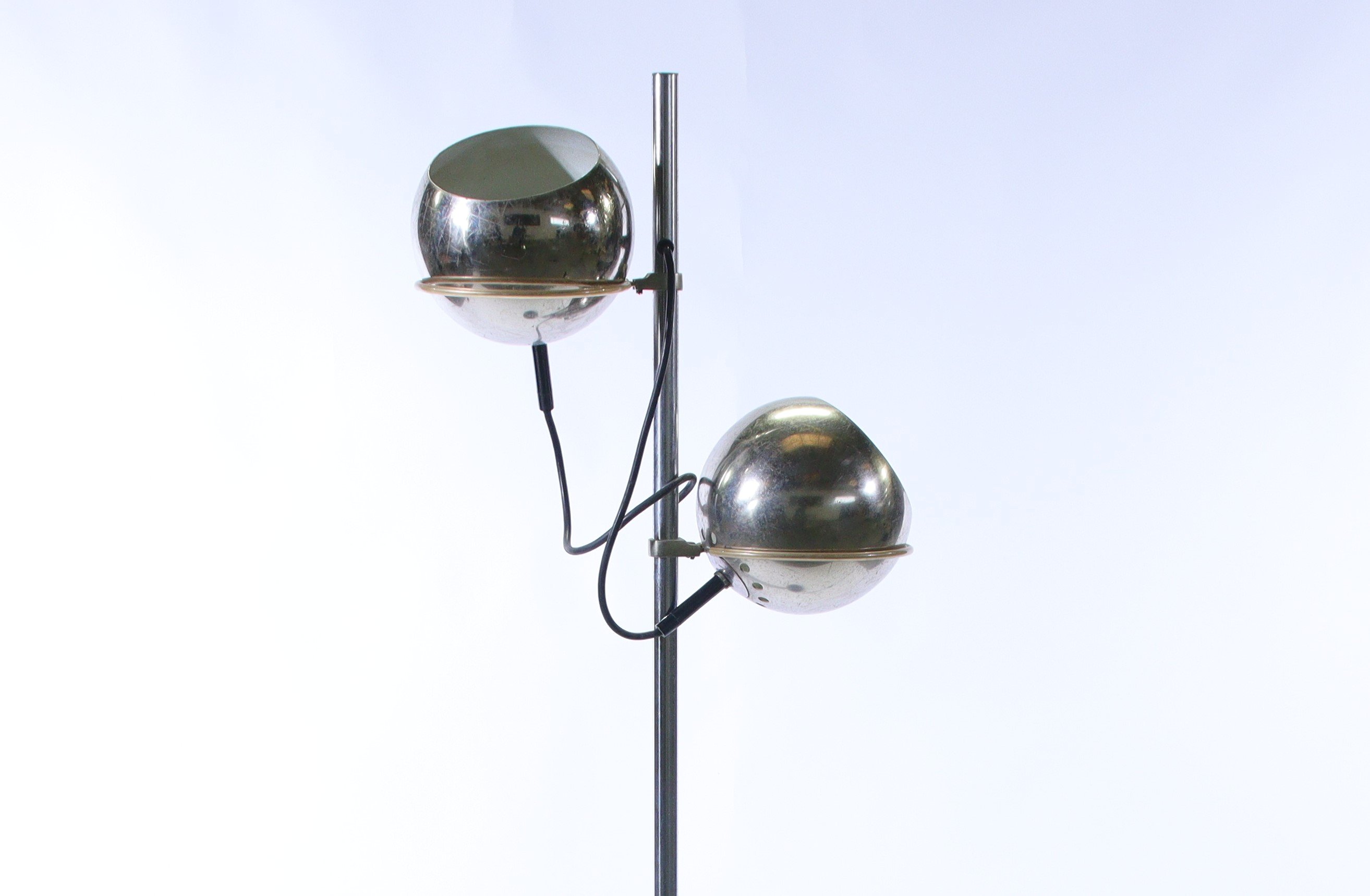 en métal chromé et doré à deux lumières, aux abat-jours en forme de sphère. Le fût circulaire repose sur une base circulaire en métal laqué noir.