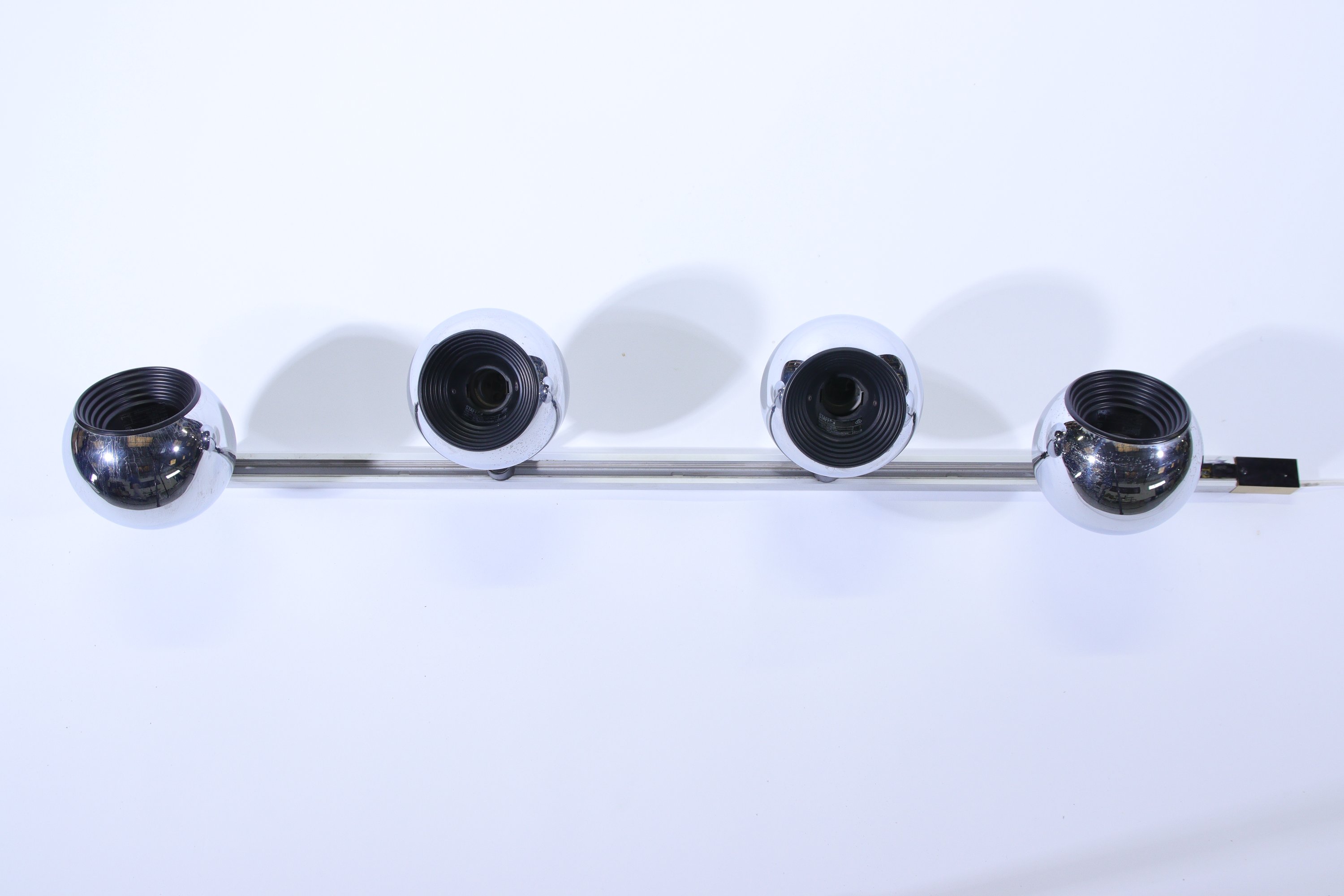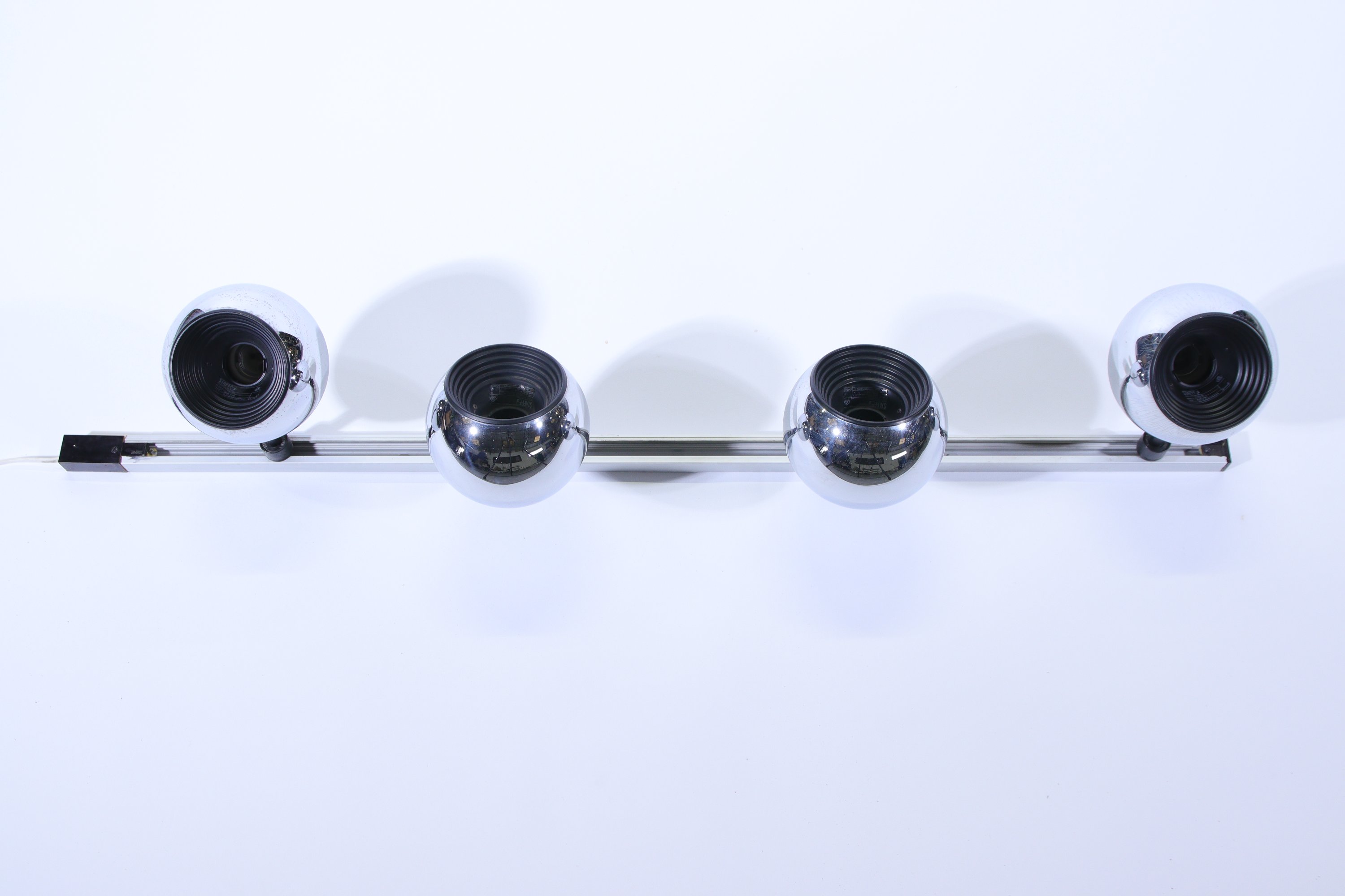 Joint : Staff. Rampe à quatre lumières, modèle n°58260 en métal chromé. Les abat-jour en forme de sphère. Etiquette. Long. 106 cm.