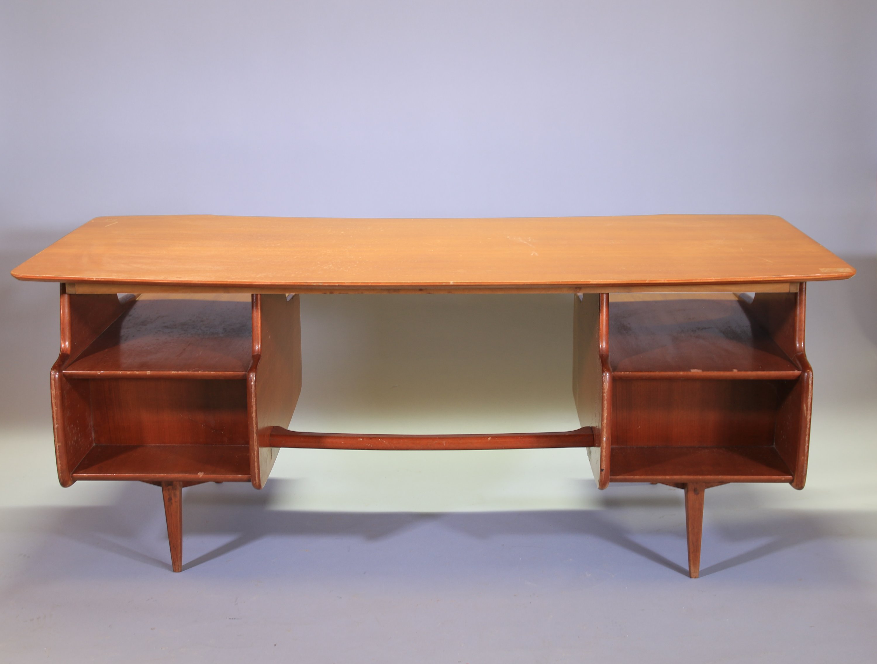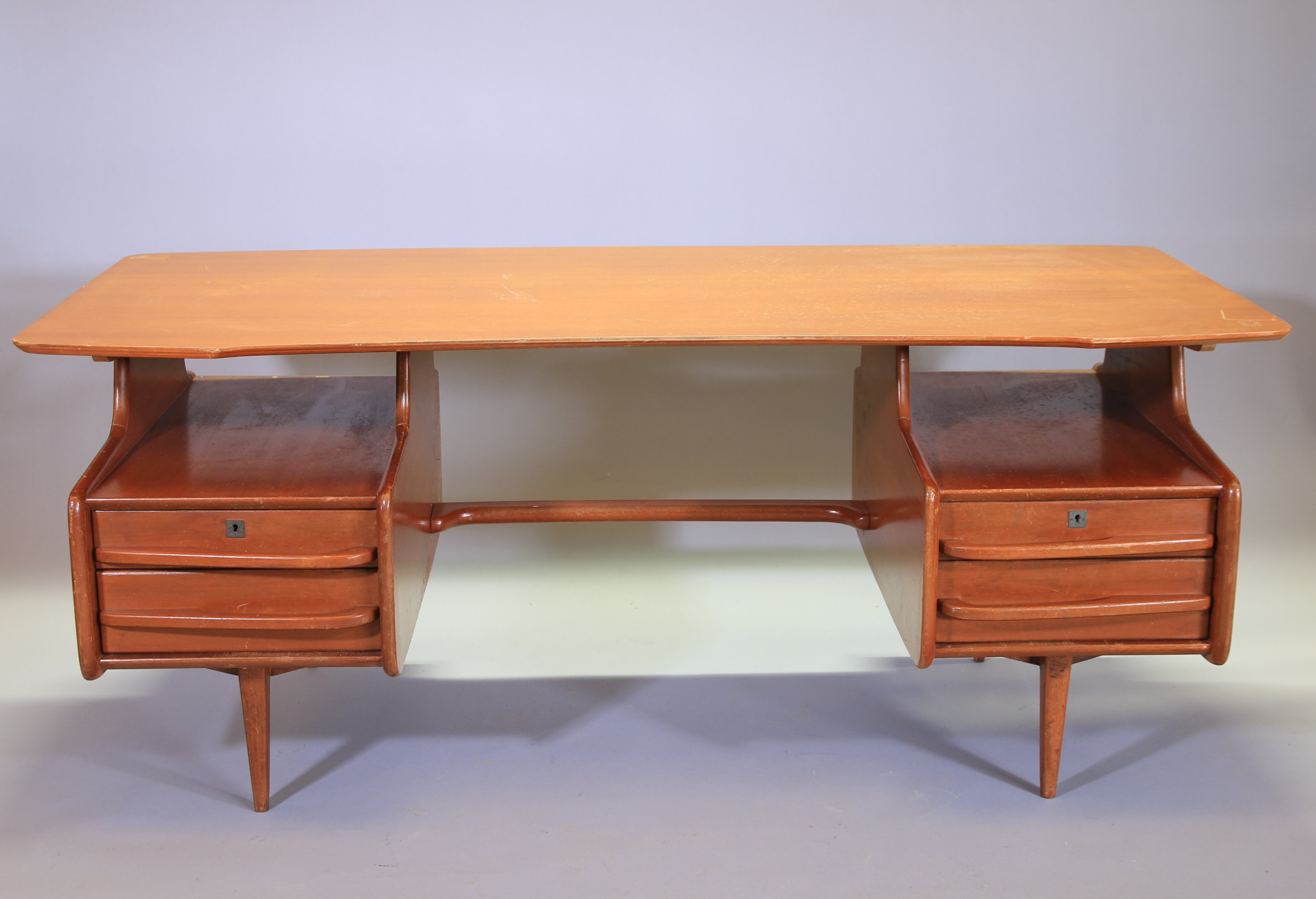 en teck. Il ouvre par deux caissons à deux tiroirs en ceinture et repose sur quatres pieds fuselés.