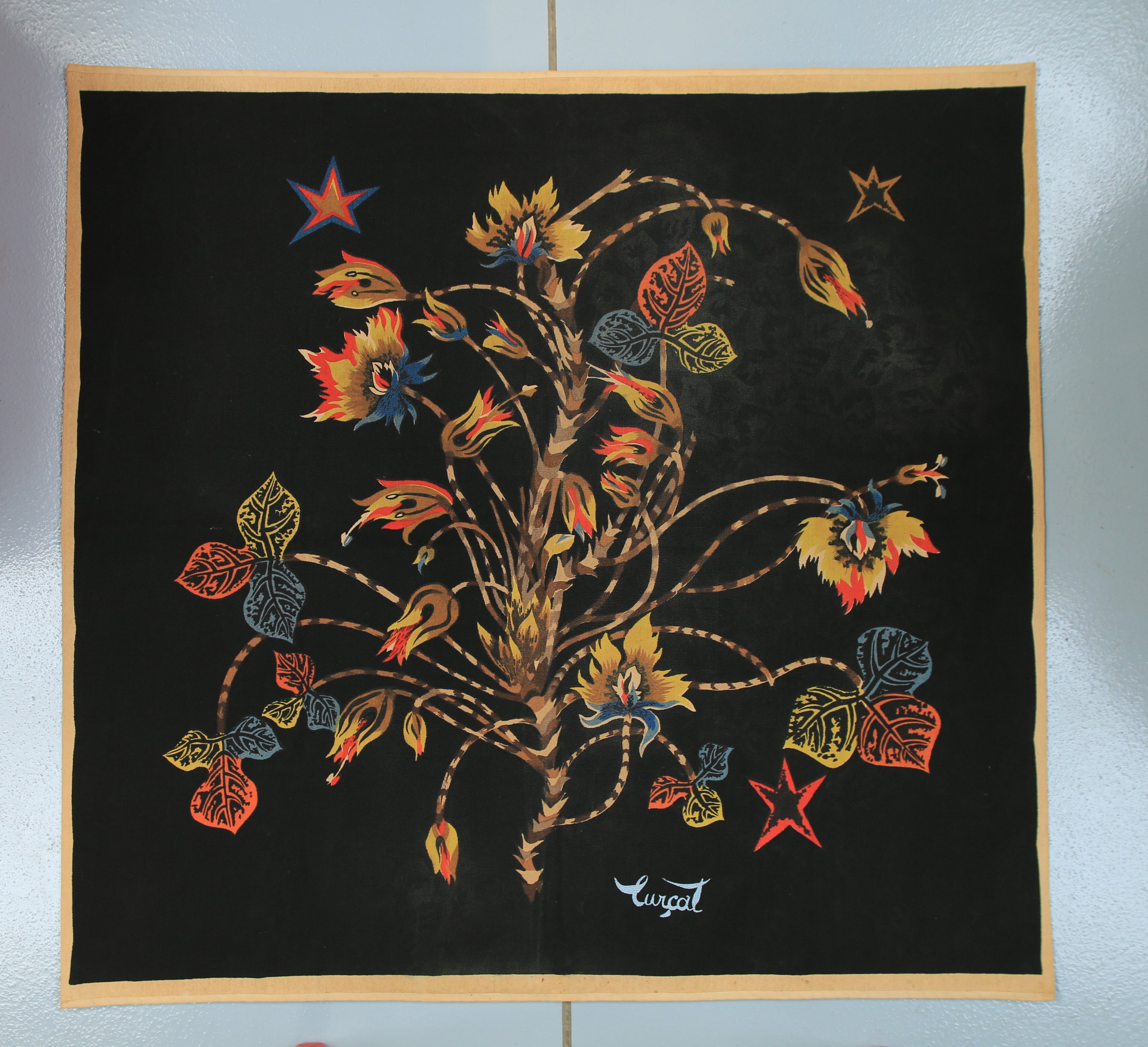Tapisserie imprimée sur fond noir.