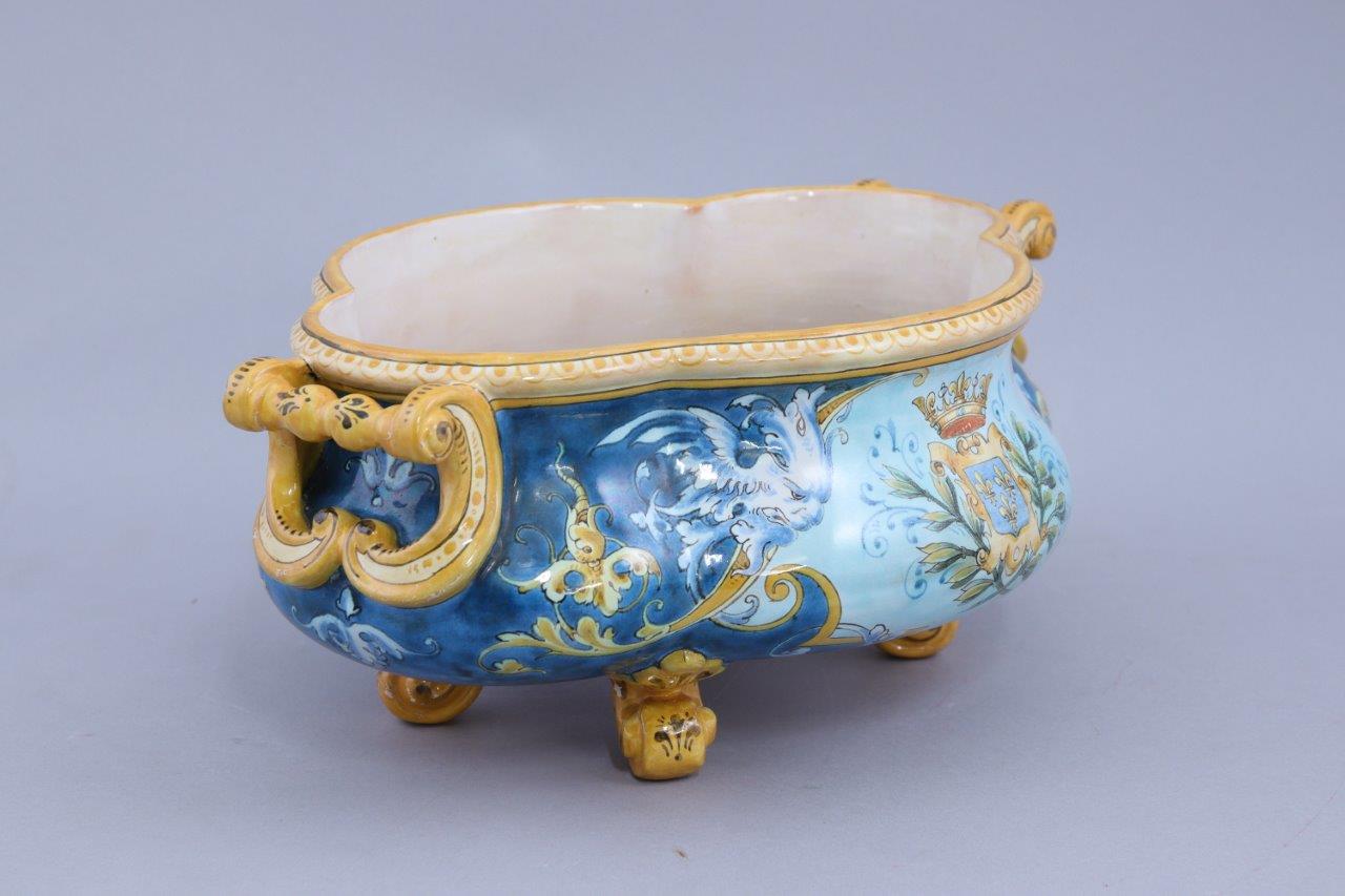 en faïence polychrome de forme quadrilobée à deux anses. La panse à décor sur une face d'un cuir aux armes de France entourée de feuilles de chêne dans un cartouche et sur l'autre d'une salamandre sous une couronne. Elle repose sur quatre pieds en enroulements.