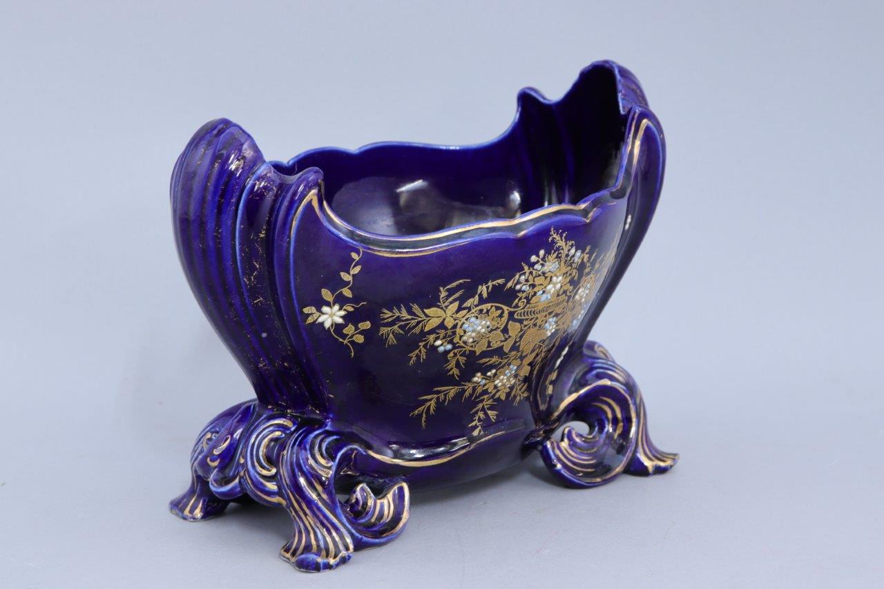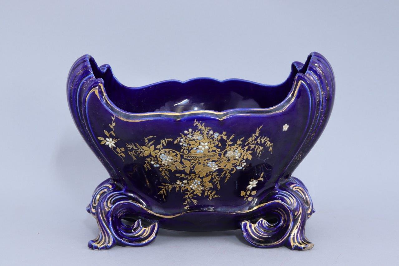 Joint : Jardinière en faience bleue de forme oblogue à la lèvre contournée, la panse décorée d'une branche fleurie réhaussée de pastilles blanches et turquoises. Quatre pieds rocailles. Haut. 20 Long. 29,5 Prof. 18 cm. (égrenures).