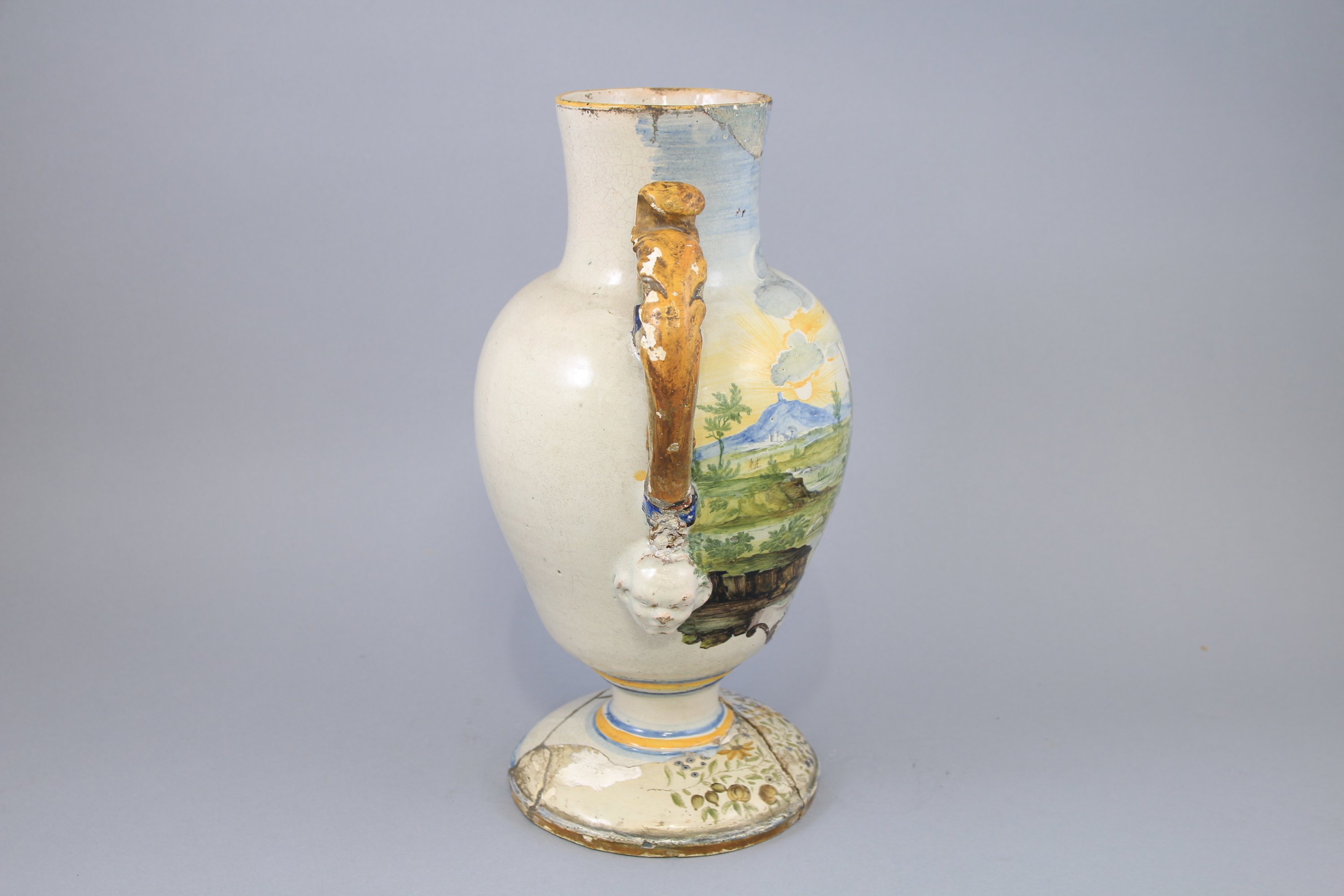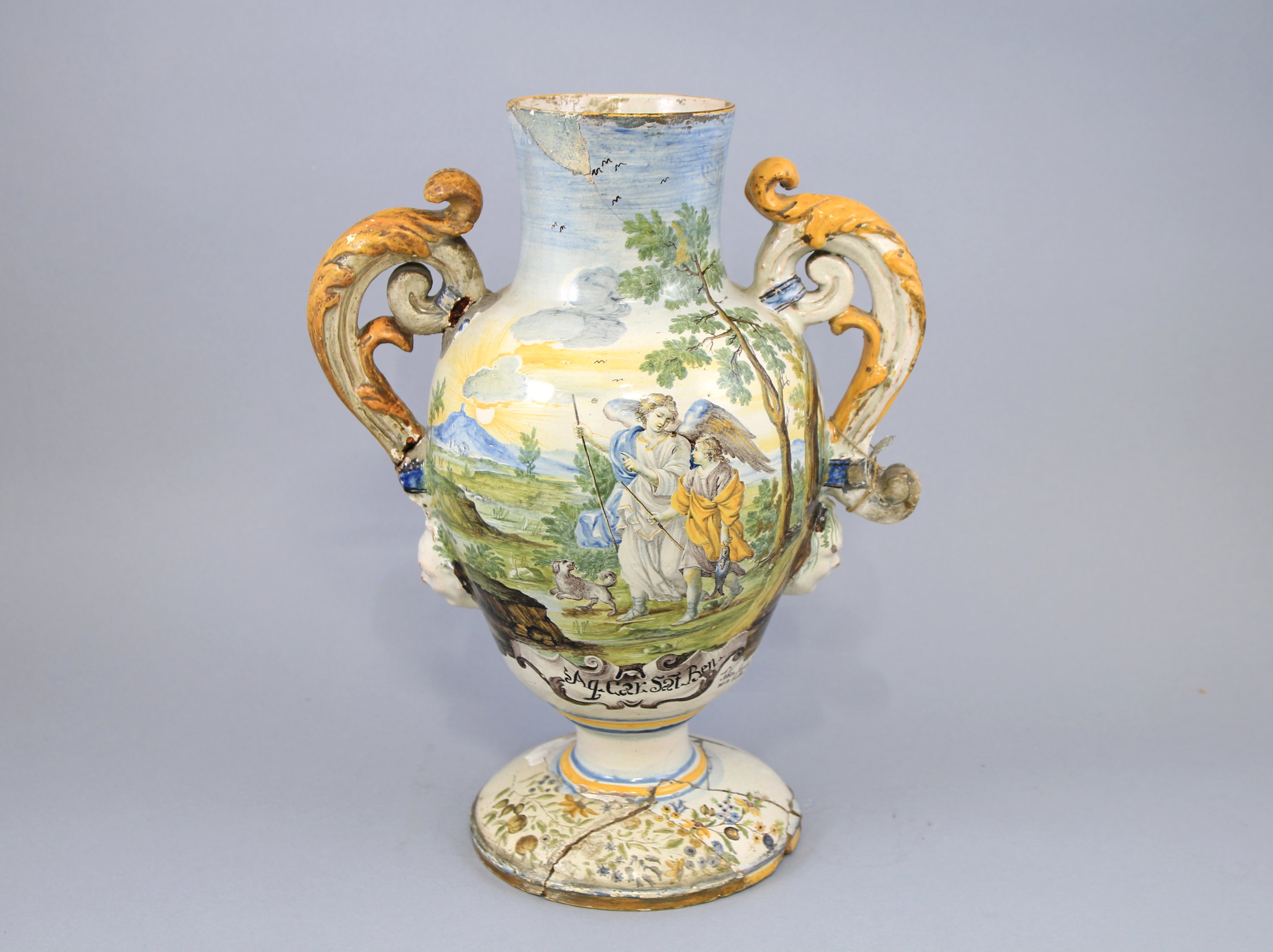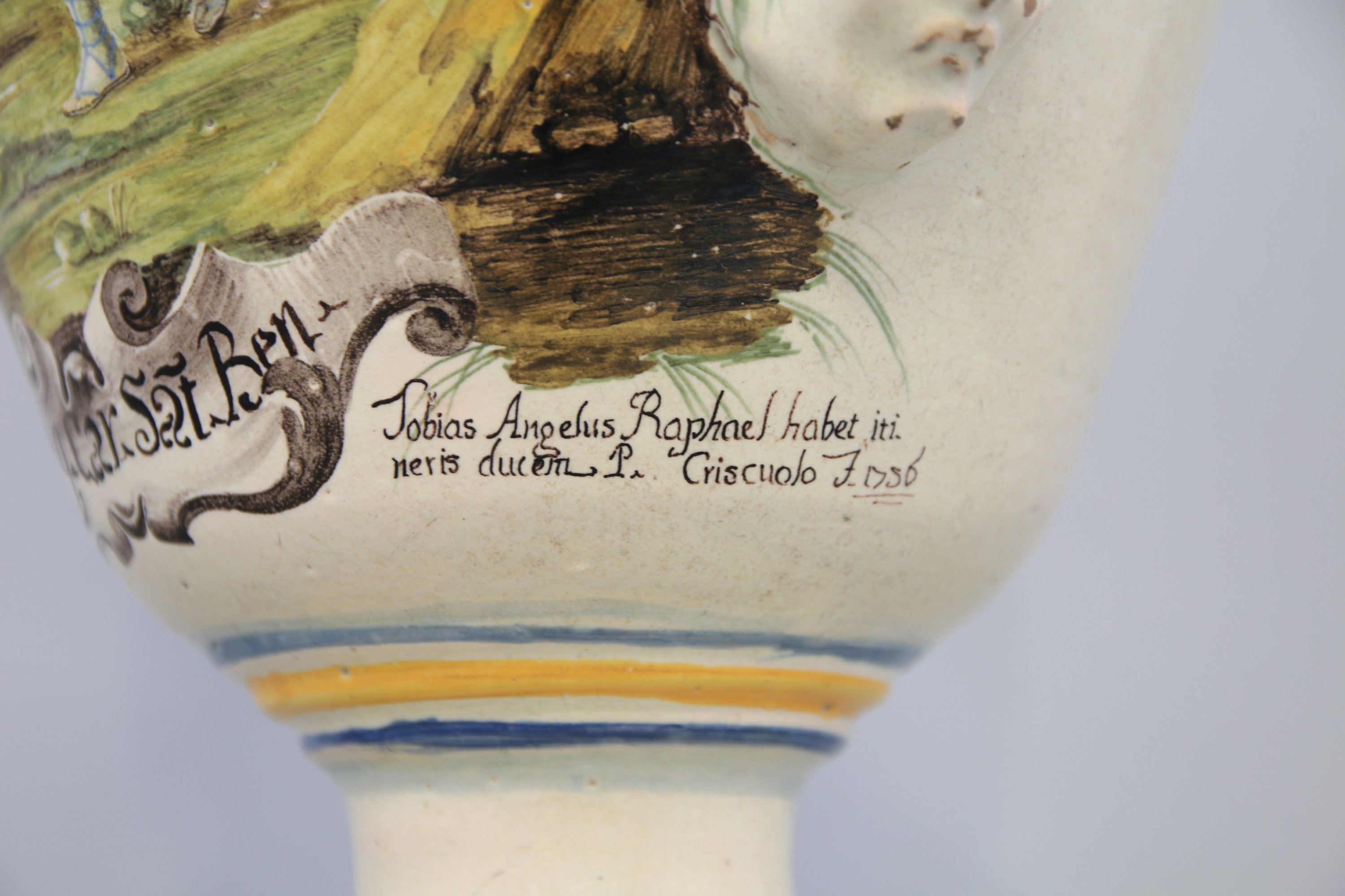 en faïence de forme balustre muni de deux anses en forme de rinceaux feuillagés, à décor polychrome sur une face de Tobi et l’Ange dans un cartouche surmontant une inscription, pharmaceutique, fleurs sur le piédouche.