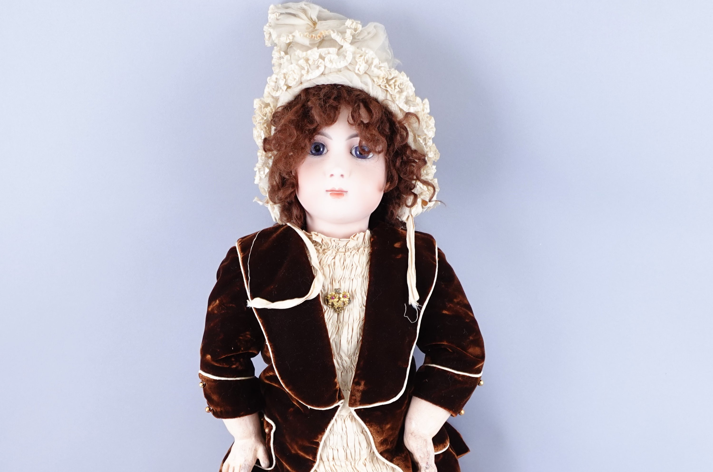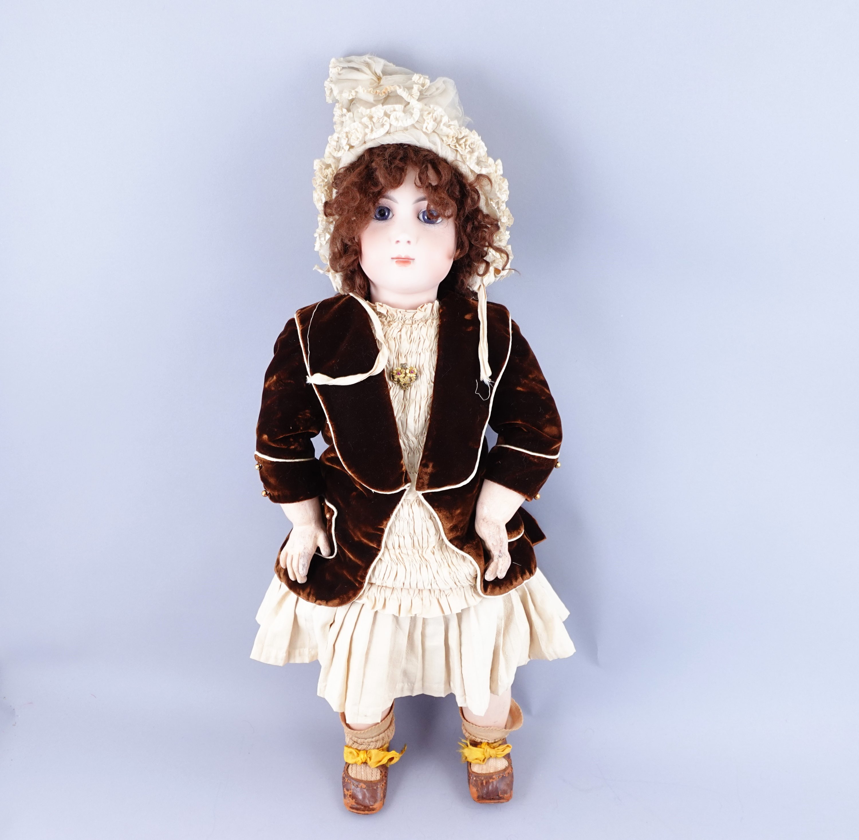 Tête en biscuit pressé. Taille 13, marquée "13". Oreilles rapportées et percées, yeux de sulfure bleus. Beau corps tout articulé à poignets fixes. Habits de style et perruque.