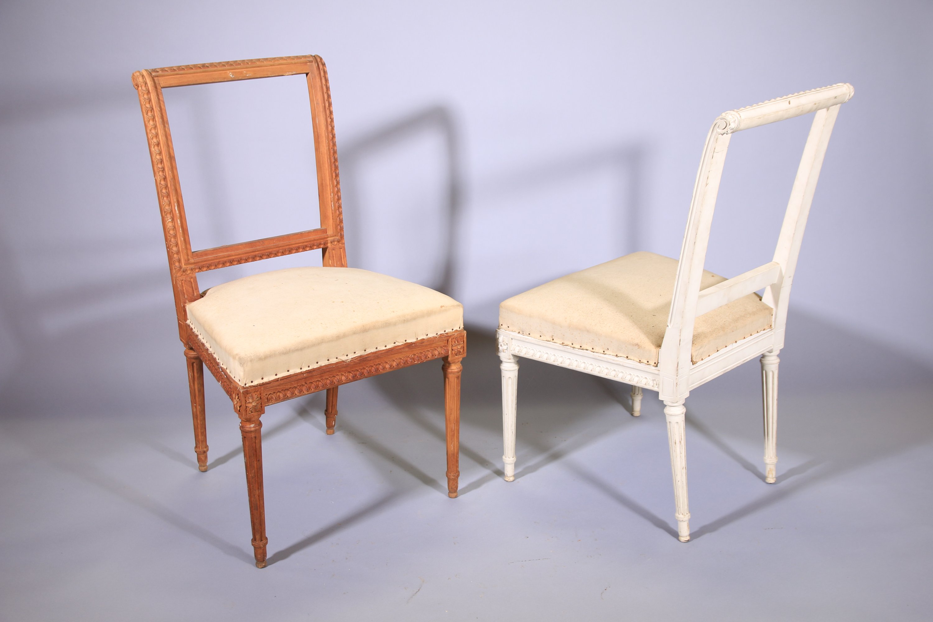 en hêtre, dont une laqué blanc. Dossier à enroulement et ceinture à décor d'une frise d'oves, dés de raccordement à décor de fleurs. Elles reposent sur quatre pieds fuselés et cannelés.