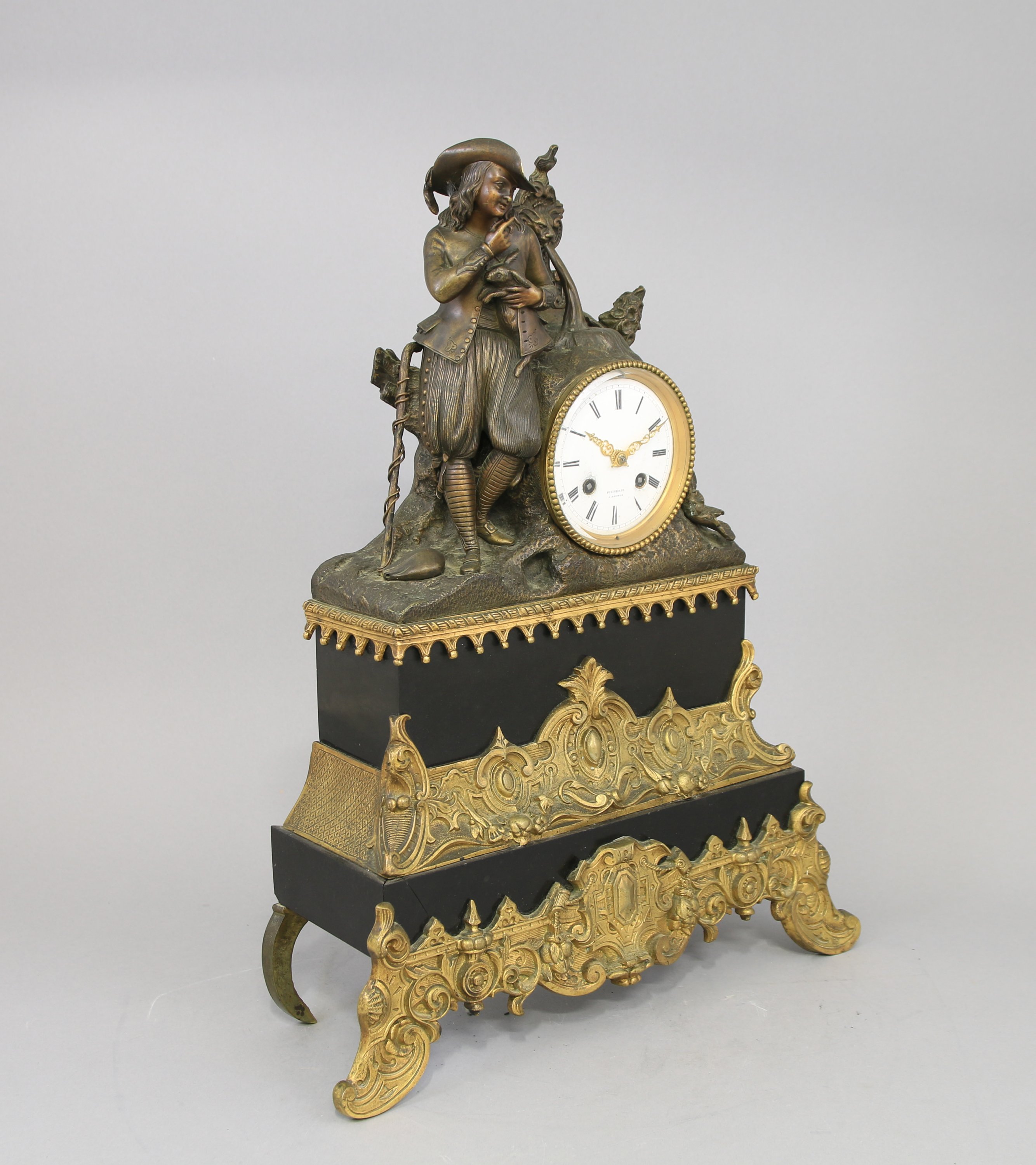 en marbre et bronze. Le cadran émaillé blanc, signé "Picherie à Saumur", indique les heures en chiffres romains, les minutes par un chemin de fer. Il est inscrit dans un rocher et supporté par une base surmontée d'une galerie de pinacles. Le piétement rectangulaire à riche décor d'enroulements et motifs de cuir. Suspension à Brocot.