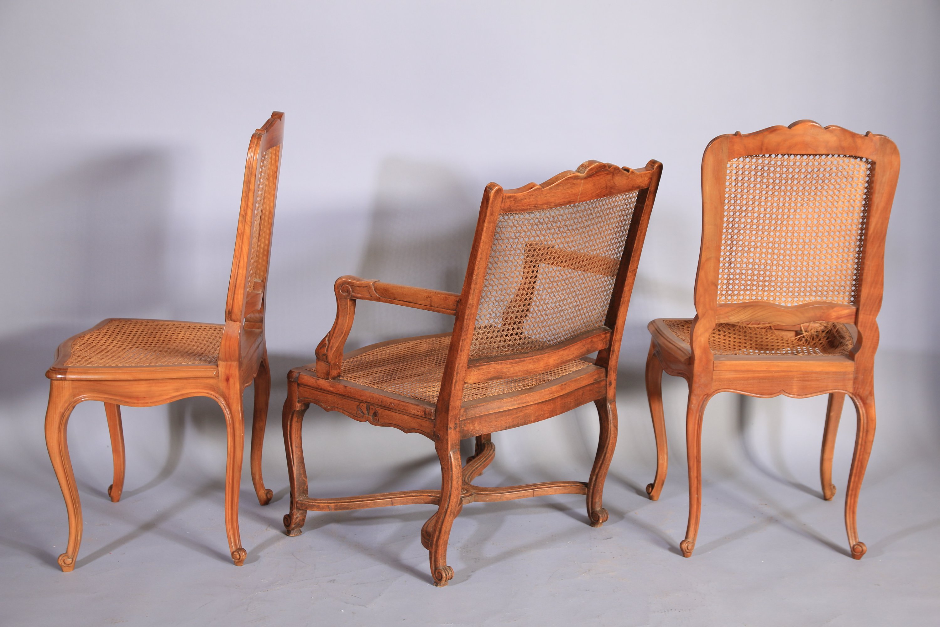 en hêtre verni, à dossier à la Reine. La ceinture chantournée à décor de coquilles et rinceaux, les pieds galbés terminés en volutes. Les accotoirs du fauteuil en retrait et les pieds reliés par une entretoise en X décorée au centre d'un médaillon à fleurettes.