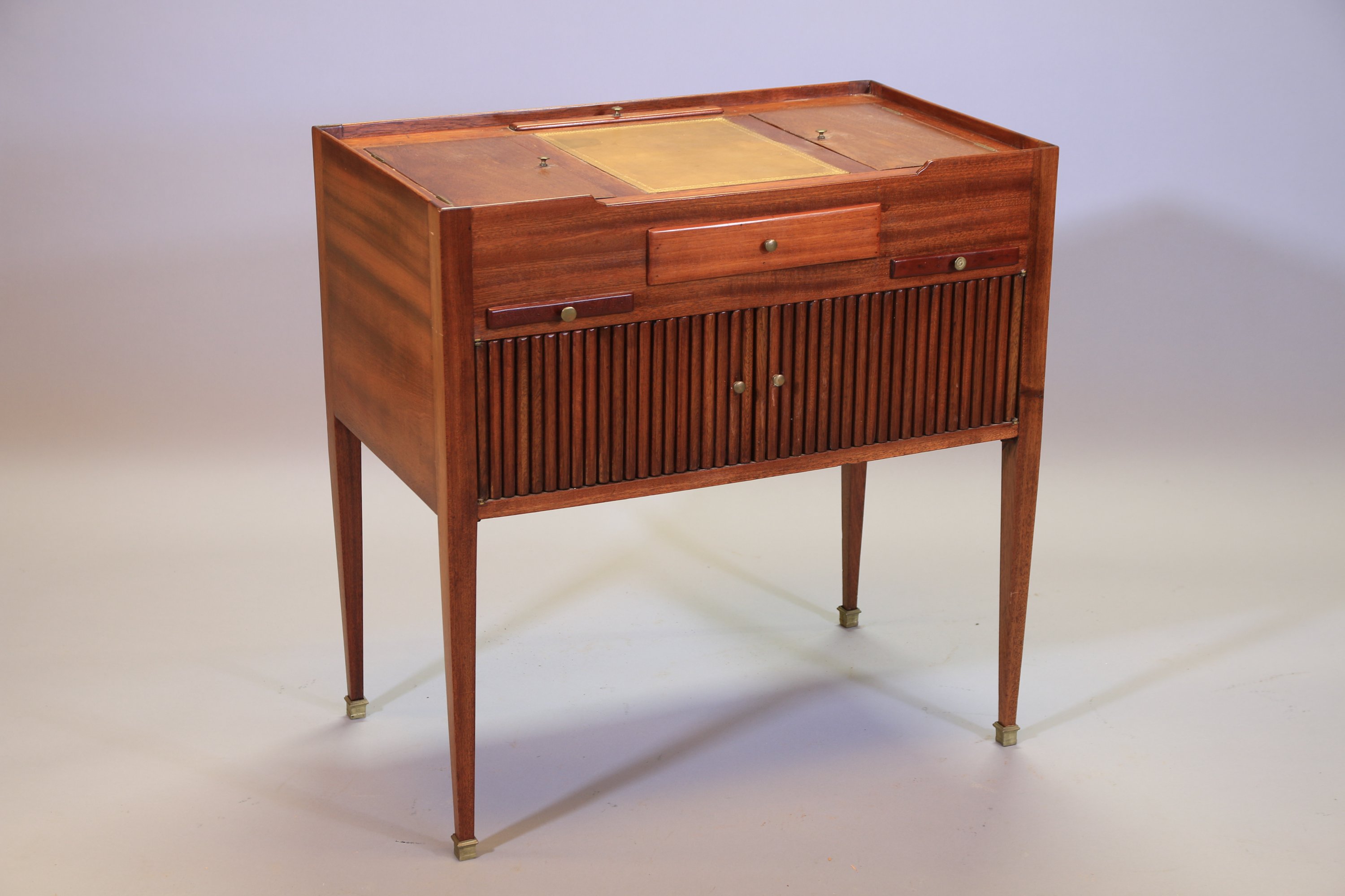 en noyer et placage de noyer. Le plateau cerclé d'une galerie et foncé d'un maroquin beige décoré aux petits fers. Il est coiffé d'un miroir escamotable et ouvre par deux abattants. La façade ouvre par un tiroir central entouré de deux tirettes. La partie inférieure est composée de deux portes à l'imitation d'un rideau. Quatre pieds gaines sabotés de laiton.