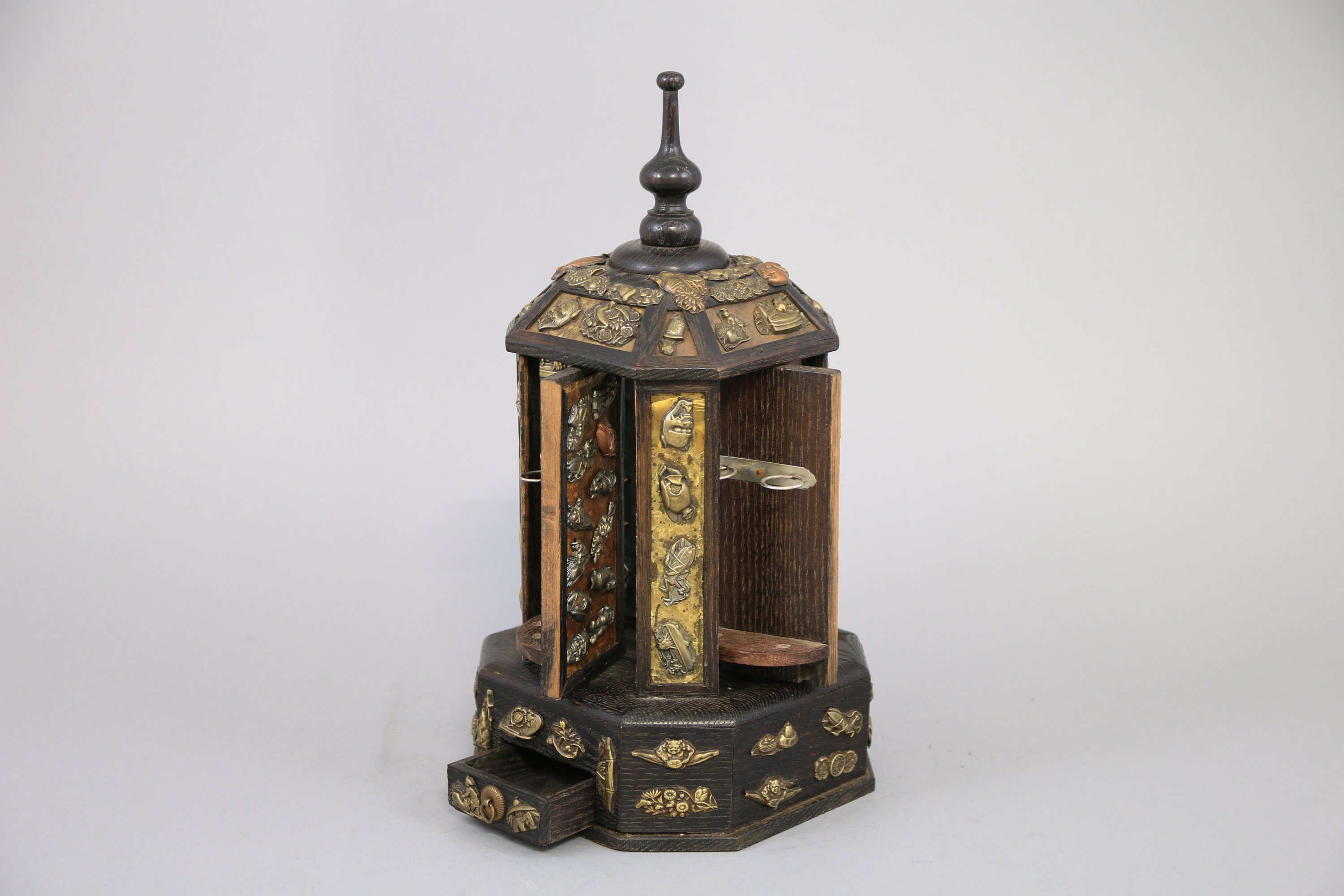 octogonale en bois laqué noire, sommée d'une poignée tournante en forme de toupie actionnant mécaniquement l'ouverture des quatre vantaux composés d'anneaux et tablettes. L'ensemble est décoré d'une centaine de menuki japonais en métal repoussé et autres boutons sur fond de cuivre. La base octogonale à pans coupés ouivre par un petit tiroir.