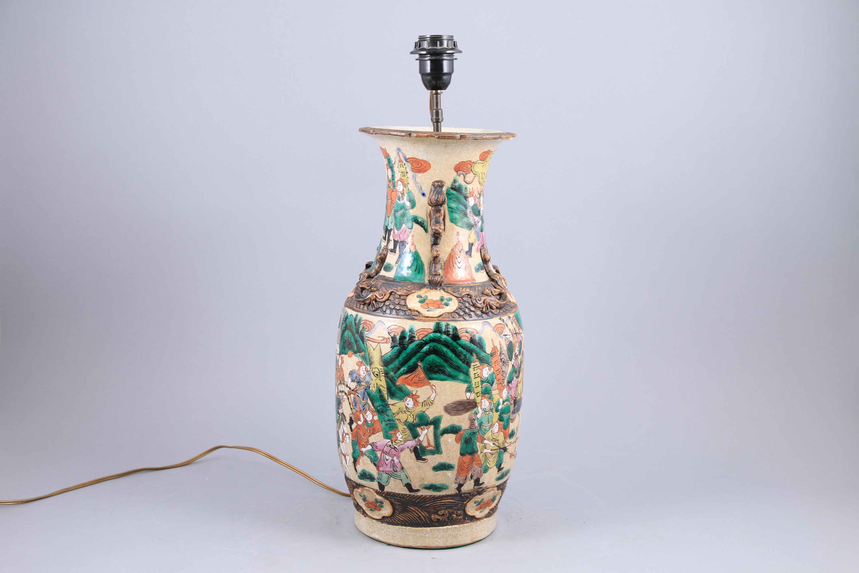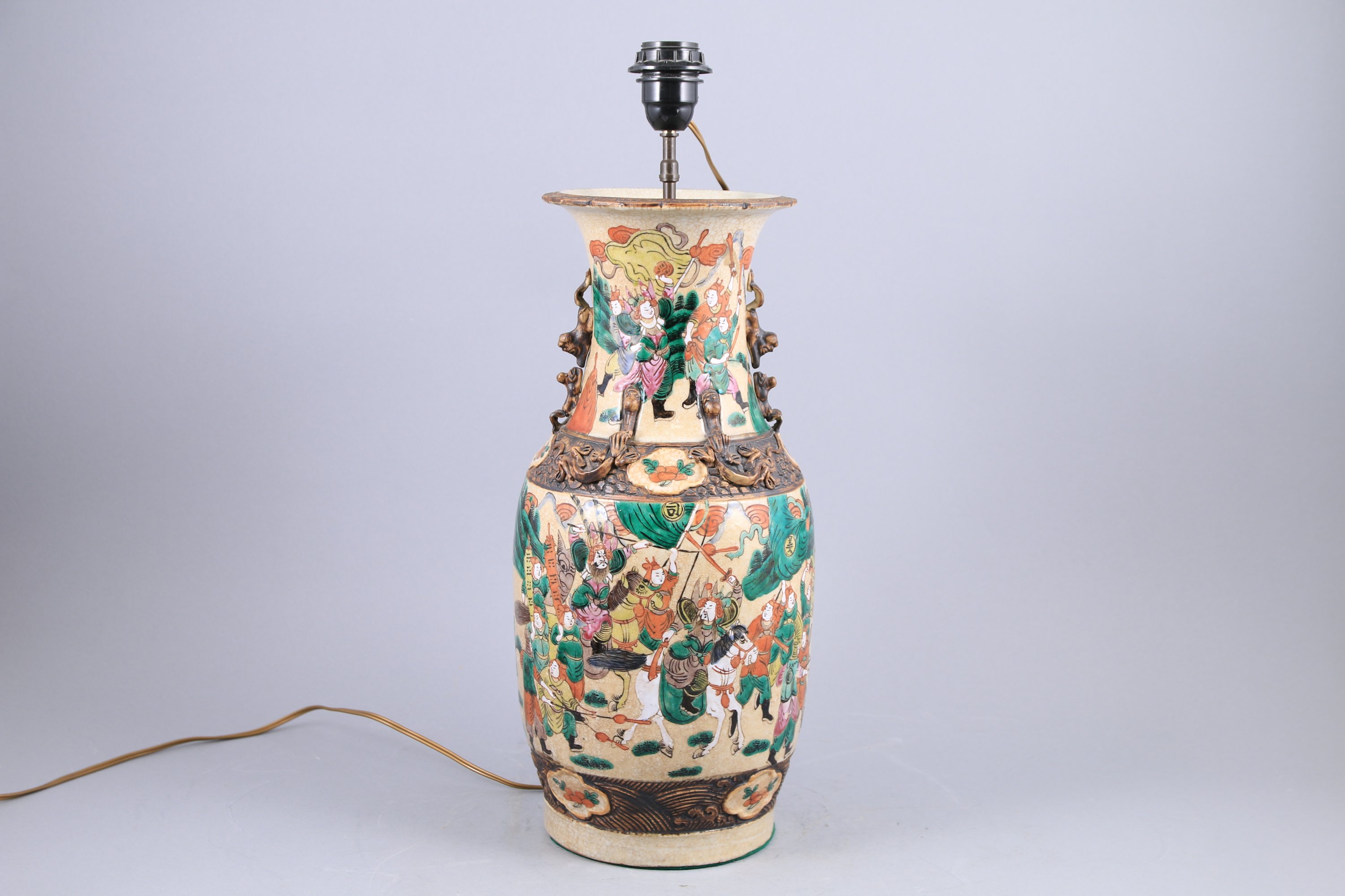 en porcelaine craquelée à décor polychrome d'une scène de bataille. Le col rehaussé de chiens de phô affrontés se prolongeant sur l'épaule de qilong. Le pied est orné de cartouche aux pêches.