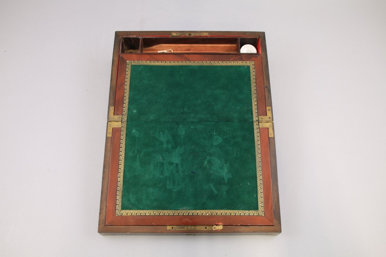 de forme rectangulaire en loupe de thuya. Il s'ouvre sur un plateau amovible foncé d'un velours vert doré aux petits fers de frises de grecques. La partie inférieure garnie d'une toile rouge formant niche. La partie supérieure comprend des emplacements pour un plumier et deux encriers.