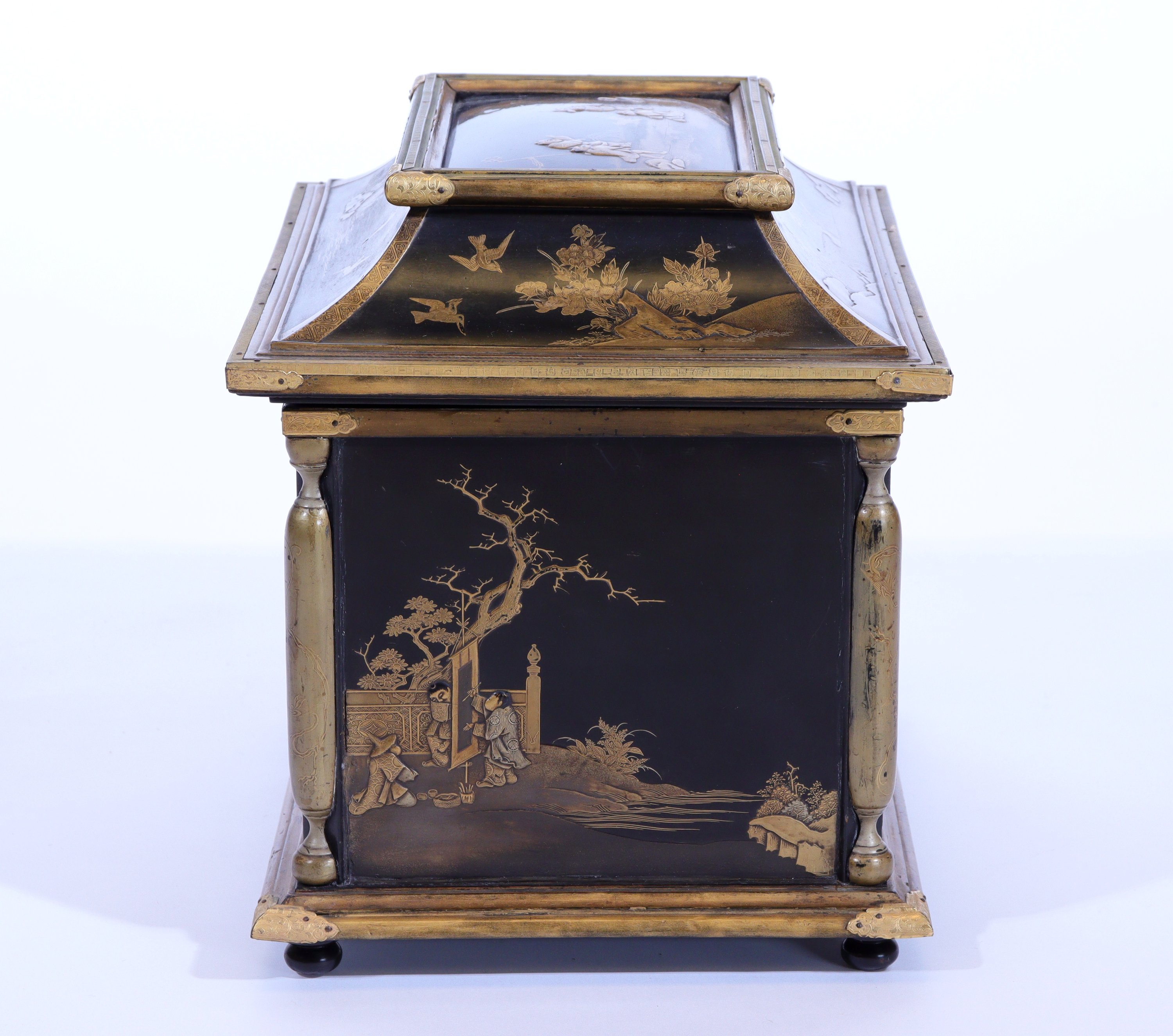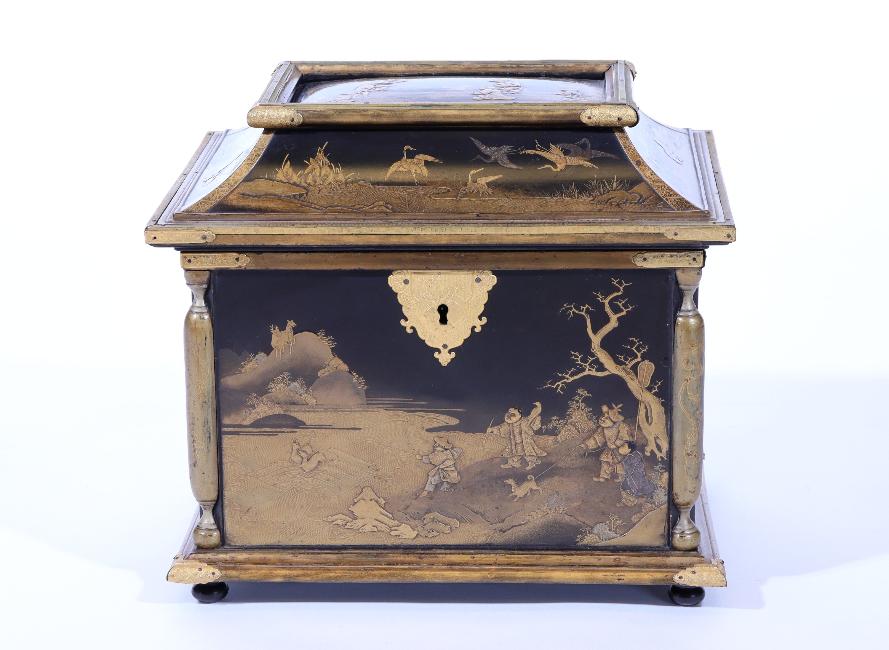 Le goût pour ces coffrets en laque de petite taille et de grande qualité est essentiellement féminin sous l'Ancien Régime. On trouve ainsi au château de Versailles la collection de boîtes en laque du Japon de la Reine Marie-Antoinette, dont aucune n'est toutefois aussi luxueuse que cet exemplaire. Réalisé au Japon dans les années 1640-1650, dans le nouveau style dit Pictorialiste mis en place pour la Compagnie des Indes Orientales Néerlandaise, ce coffret en pagode a probablement été agrémenté en Europe au XVIIIe siècle d'accessoires en cristal, argent ou or pour en faire un nécessaire à écrire, de toilette ou un coffre à bijoux. Le marchand mercier Gersaint en fait la publicité suivante en 1747 : " boëte de forme presque quarré est d'un fond d'ancienne aventurine orné de branchages de relief surdorés. Elle est propre à faire une magnifique cave ou un nécessaire". Madame de Pompadour avait elle-même choisi un "coffre en laque fermant à clé et à trois tiroirs pour serrer ses diamants", acheté 400 livres, chez Lazarre Duvaux en 1754. La marquise possédait au moins trois autres boîtes en laque noir et or semblable à celle-ci pour conserver ses pièces d'or, ou transformées en encrier, comme celle dans la vente de la duchesse de Mazarin en 1781 (Castellucio, 2019, p.123).Avec leurs luxueux décors en relief et leurs précieux piliers dans les angles, ces boîtes sont les plus riches exemplaires qui nous soient parvenus. Elles figurent dans les plus grandes collections, en Europe comme au Japon. Le Cardinal Mazarin conserve une seule paire de ces petits coffres "de verny de la Chine aussy en forme de tombeau l'un dont les collonnes aux encoigneures sont unies dorées et celles de l'autre a balustres doré et noir" (n°837). Si Impey et Jorg ont identifié 11 coffrets en pagode à travers le monde, dérivant de l'exceptionnel "Chiddingston casket" conservé à l'Amolean Museum d'Oxford, ce coffret est le seul dont les paysages soient agrémentés de personnages. Comme sur les quatre grands "coffres de Mazarin", à Londres, Amsterdam, Berlin et Moscou, de truculentes scènes de la vie du Japon ornent les panneaux de cette boîte : des joueurs de Go sont installés dans un jardin sur l’un des côtés pendant qu'un artiste peint de l'autre, des chasseurs à l'arc tirent à l'occasion d'un bat-l'eau sur des daims en façade, des oiseaux volent sur la face arrière et sur les côtés du couvercle tandis que des enfants facétieux montrent du doigt le reflet de sa propriétaire dans le miroir intérieur.