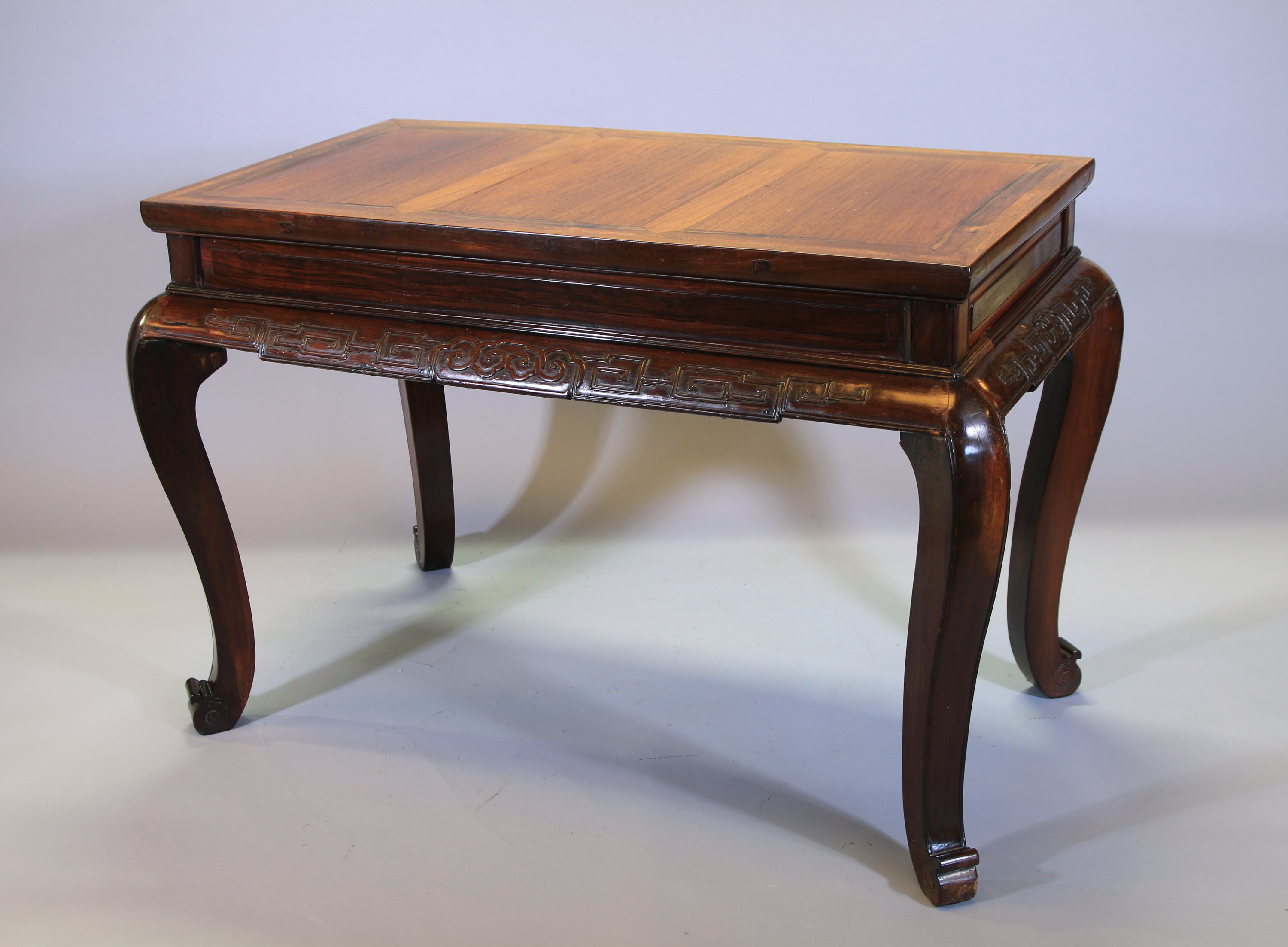 en bois exotiques. La ceinture à décor de grecques et d'enroulement, les pieds galbés terminés par des enroulements.